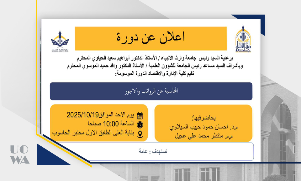 تقيم كلية الإدارة والاقتصاد في جامعة وارث الانبياء (ع) دورة بعنوان "المحاسبة عن الرواتب والاجور"