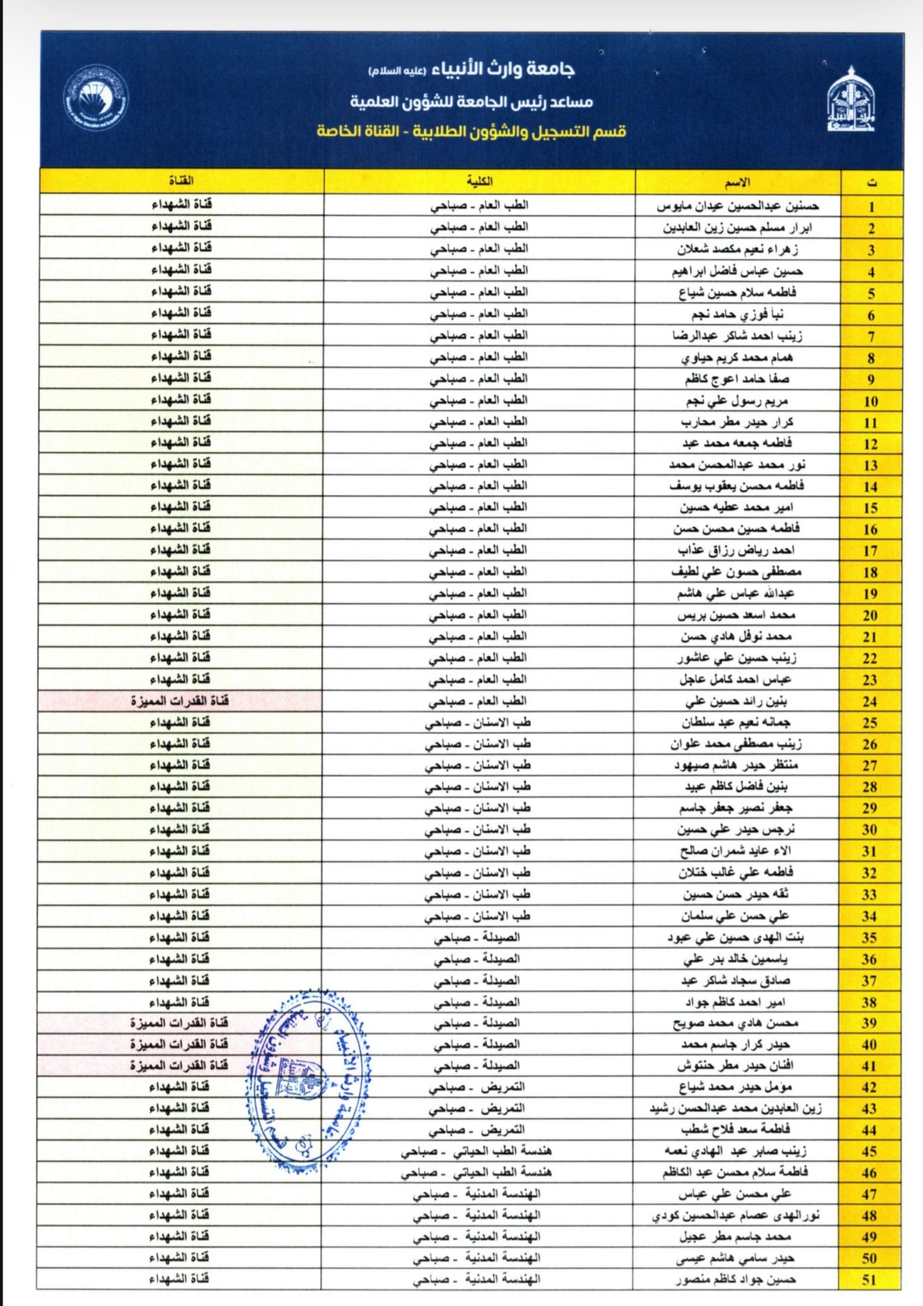 الطلبة الأعزاء المدرجة أسماؤهم ضمن القوائم القبول في