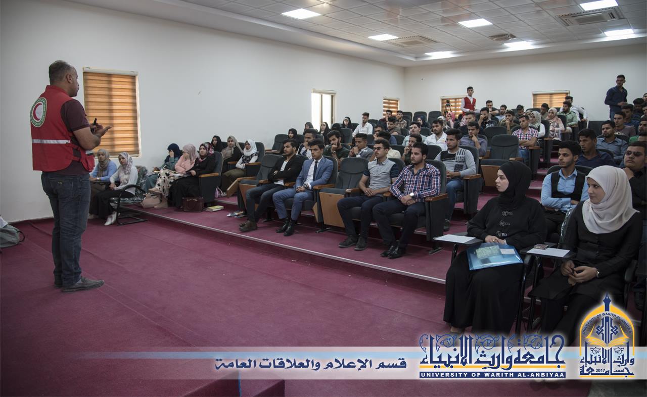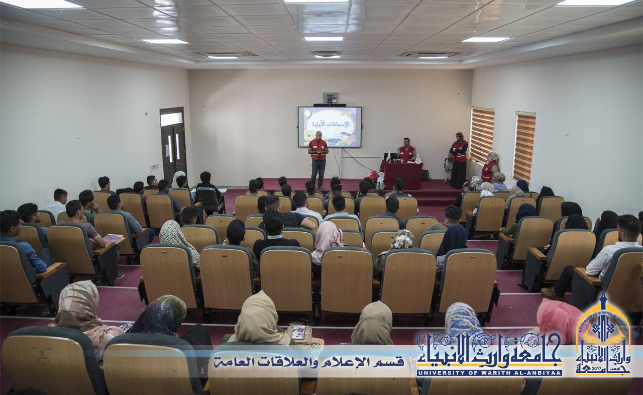 حرصا على تفعيل الخدمة التطوعية ودعم العمل التطوعي جامعة وارث الانبياء وبالتعاون مع جمعية الهلال الاحمر العراقية فرع كربلاء المقدسة تقيم ورشة عمل للاسعافات الاولية لطلبة الجامعة، وقال مدرب جمعية الهلال الأحمر صباح الهلالي ان ورشة العمل تضمنت عملية تثقيف بمبادئ الهلال الاحمر والية العمل وكيفية المساعدة في الحالات الاولية للمصاب، واضاف قائلا انه كان هناك تعاون عالي من قبل الجامعة والطلبة وحماس في بذل انفسهم ووقتهم للعمل التطوعي وسيكون هناك برامج مكثفة في الايام القادمة حول كيفية التعامل مع المصاب واسعافه بصورة الصحيحة.