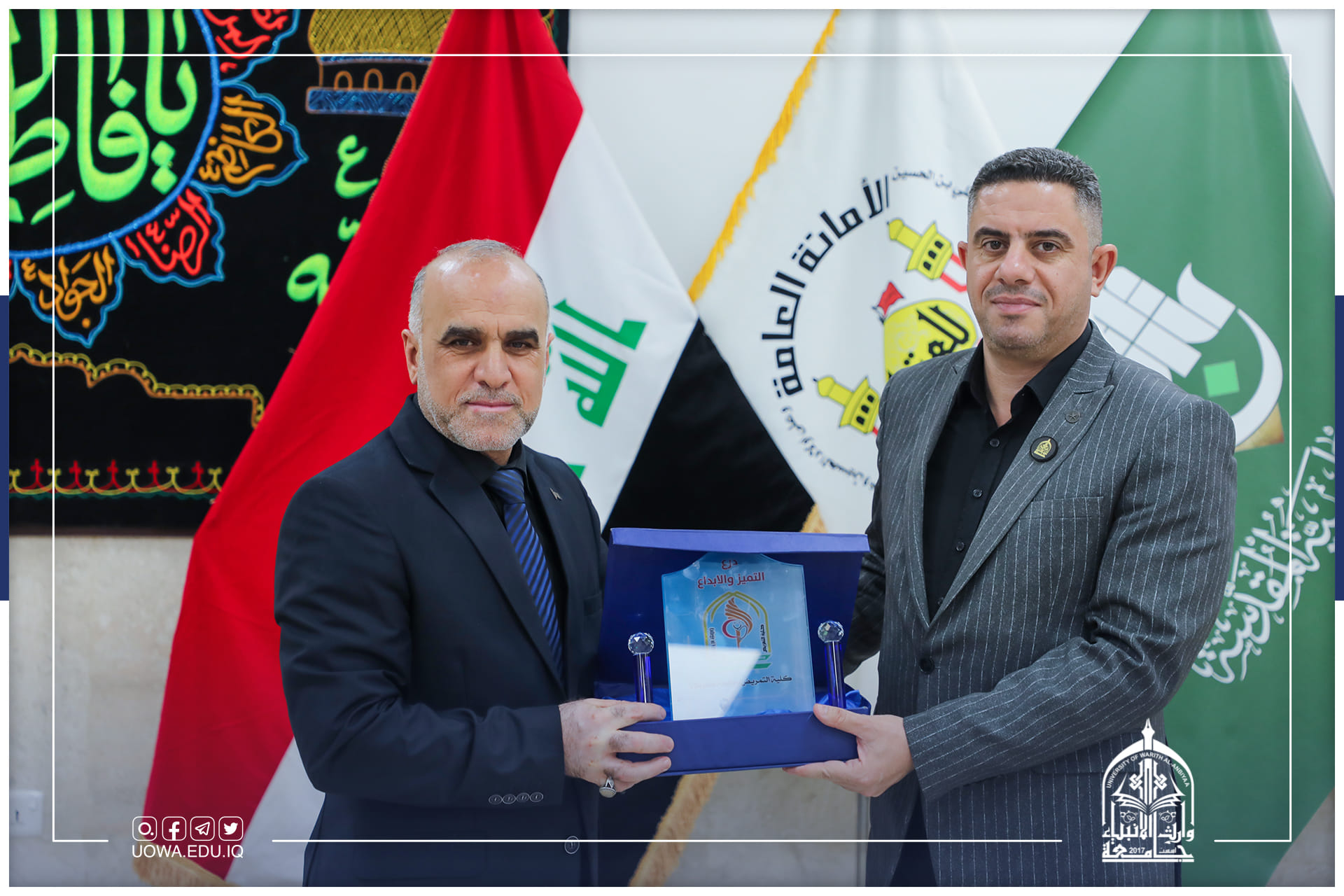 استقبل السيد المساعد العلمي الاستاذ الدكتور عباس الدعمي، وفد من كلية التمريض في جامعة كربلاء برئاسة عميد الكلية ورئيس لجنة عمداء كليات التمريض العراقية الاستاذ الدكتور علي كريم خضير الذي زار الجامعة لتقديم درع التميز والابداع للسيد رئيس الجامعة وتسلمه بالنيابة السيد المساعد العلمي والسيد عميد كلية التمريض والسيد عميد كلية الطب ذلك لمساهمتهم الفاعلة وتعاونهم في انجاح الإمتحانات النهائية التقويمية للطلبة للعام الحالي 2021 -2022 إضافة الى كتب شكر وتقدير.