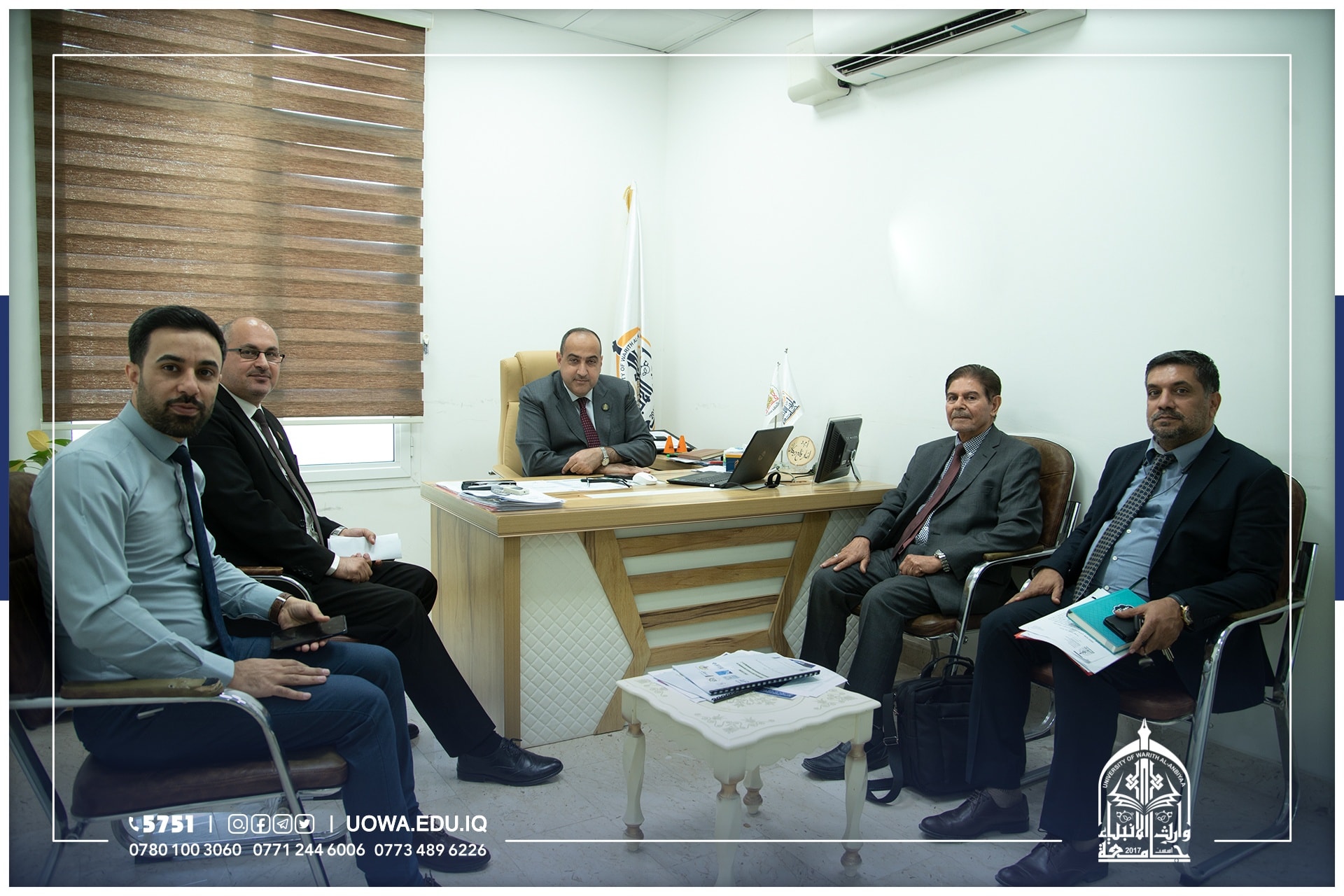 اجتمع السيد رئيس الجامعة الاستاذ الدكتور ابراهيم الحياوي بالبروفيسور حسن النجم رئيس مركز تطوير المواد الانشائية في جامعة ليفربول جون مورس البريطانية والسيد عميد كلية الهندسة الدكتور حسين هادي والسيد رئيس قسم الشؤون العلمية والسيد رئيس قسم ضمان الجودة