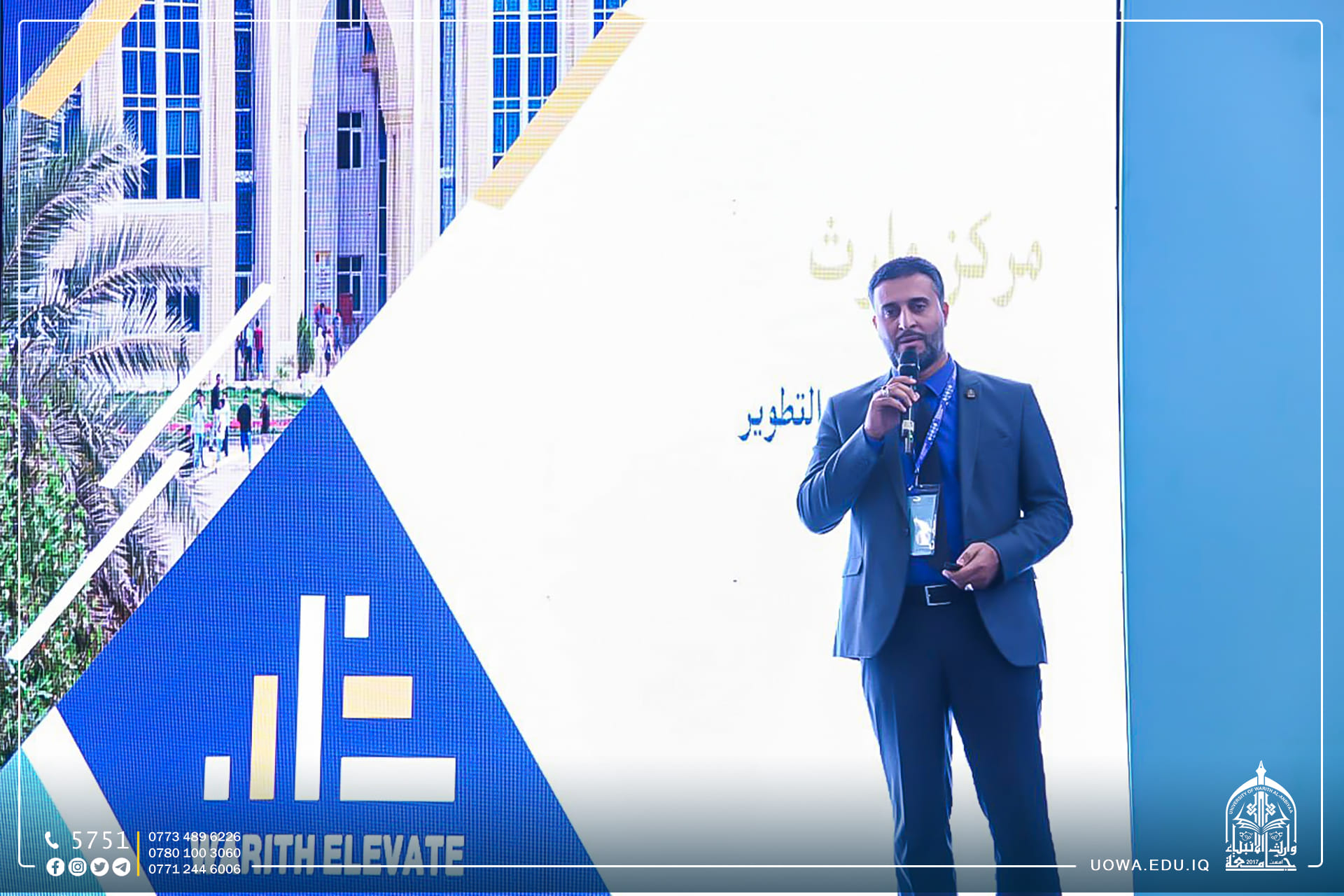 يواصل جناح جامعة وارث الانبياء بالمشاركة في تقديم العديد من الفعاليات العلمية والأكاديمية ضمن " مؤتمر ومعرض العراق للتعليم" حيث قدم فريق Warith Elevate شرحاً عن خدمات المركز لخريجي وطلبة الجامعة وكيفية المساهمة في تأهيلهم وتدريبهم لتهيئتهم للإنخراط في سوق العمل، وتوظيفهم ضمن مؤسسات العتبة الحسينية المقدسة بالإضافة الى دعم الجامعة "لمبادرة ريادة الحكومية" عبر إقامتها للدورات التدريبية في الجامعة.