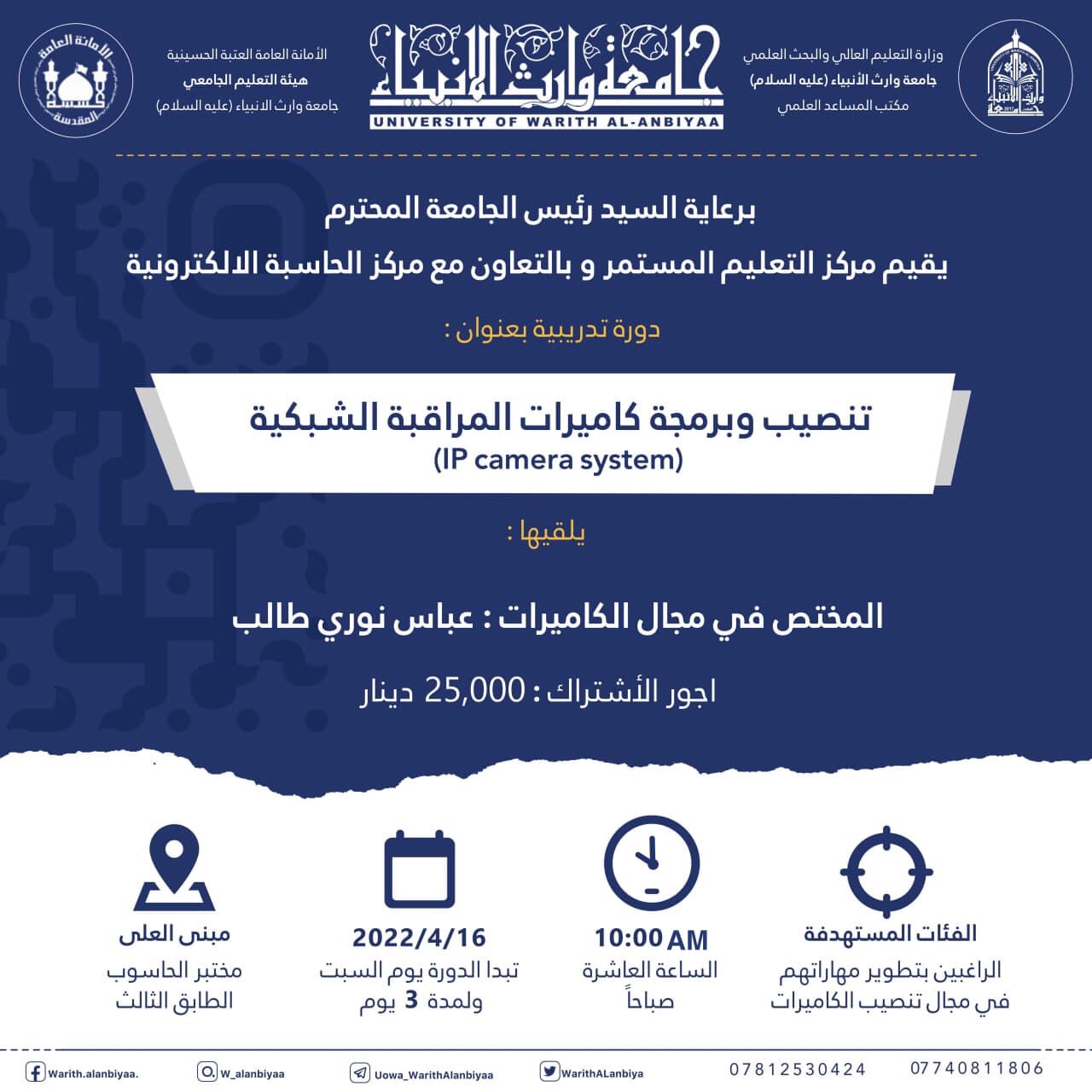 برعاية رئيس الجامعة الاستاذ الدكتور ابراهيم الحياوي نظم مركز التعليم المستمر بالتعاون مع مركز الحاسبة الالكترونية دورة تدريبية بعنوان " تنصيب وبرمجة كاميرات المراقبة الشبكية" IP camera system وذلك ابتداءً من السبت الموافق 16-4-2022 ولمدة ثلاثة أيام