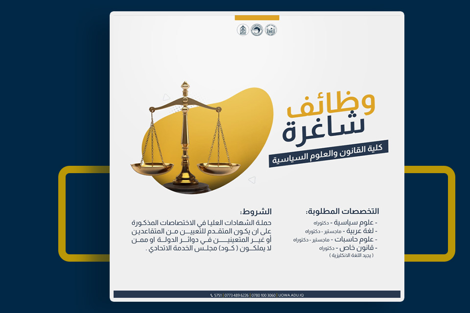 تعلن جامعة وارث الانبياء (عليه السلام)/ كلية القانون والعلوم السياسية عن حاجتها الى درجات وظيفية (متقاعدين، أو غير متعين في دوائر الدولة، ولايمتلك كود تعيين على مجلس الخدمة الإتحادي).