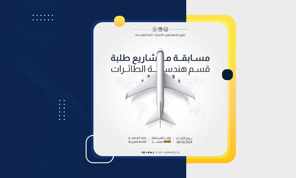 تدعوكم كلية الهندسة في جامعة وارث الأنبياء (عليه السلام) لحضور )مسابقة مشاريع طلبة قسم هندسة الطائرات) يوم غد الثلاثاء.