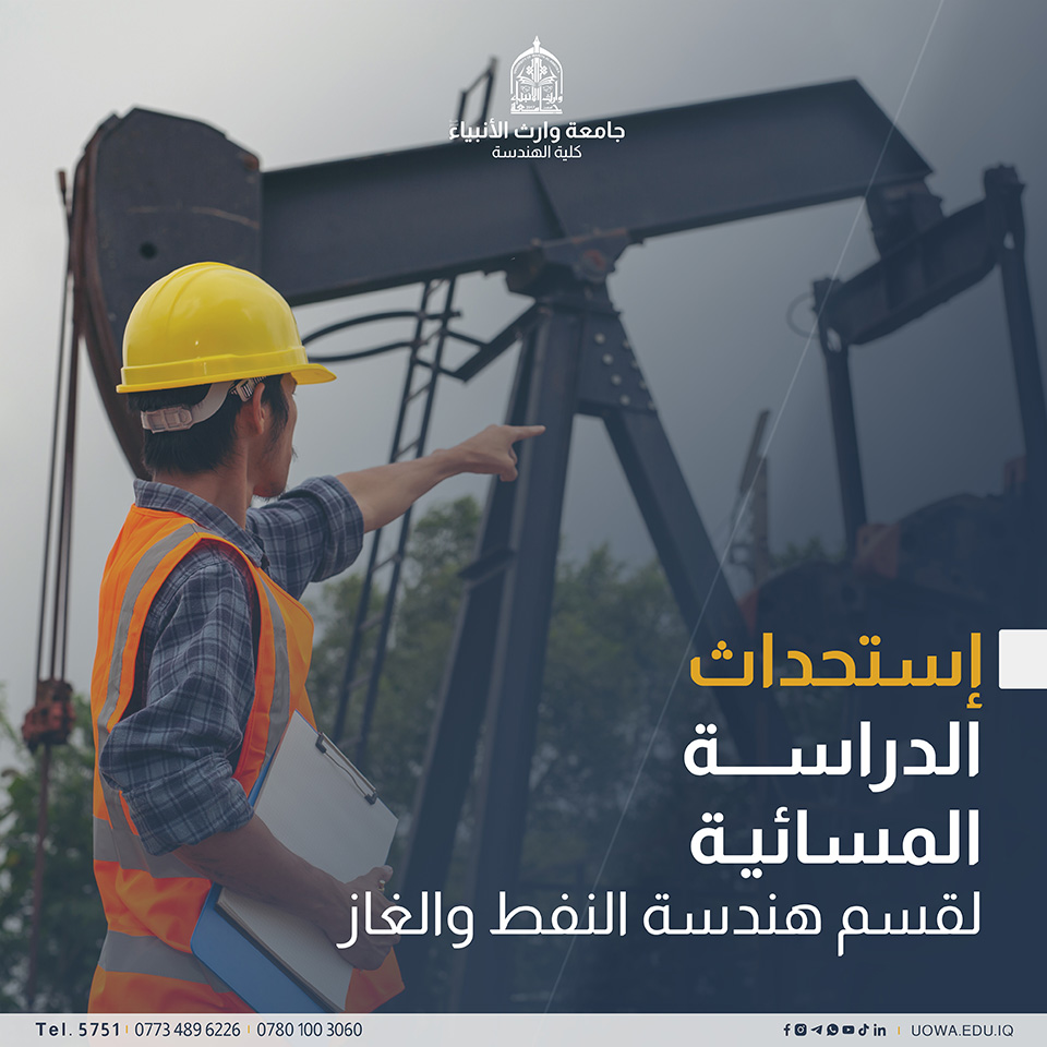 أعلنت جامعة وارث الأنبياء (عليه السلام) عن استحداث برنامج الدراسة المسائية في قسم هندسة النفط والغاز بكلية الهندسة. هذا التوسع الجديد يهدف إلى توفير المزيد من الفرص التعليمية للطلاب الراغبين في متابعة دراستهم في هذا المجال الحيوي.