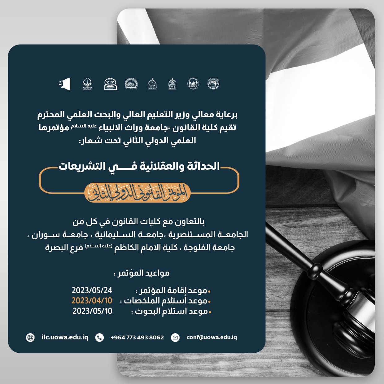 تدعوكم جامعة وارث الانبياء(عليه السلام) لحضور "المؤتمر القانوني الدولي الثاني" تحت شعار الحداثةوالعقلانية في التشريعات" اليوم الاربعاء المصادف 24-5-2023