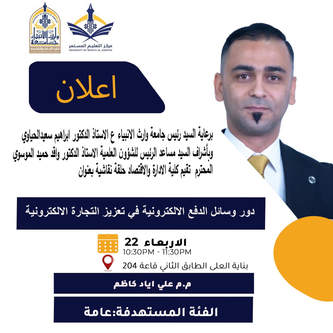 وذلك في يوم الاحد الموافق 19/10/2025 الساعة العاشرة صباحا في بناية العلى الطابق الاول/ مختبر الحاسوب