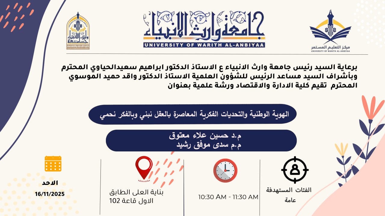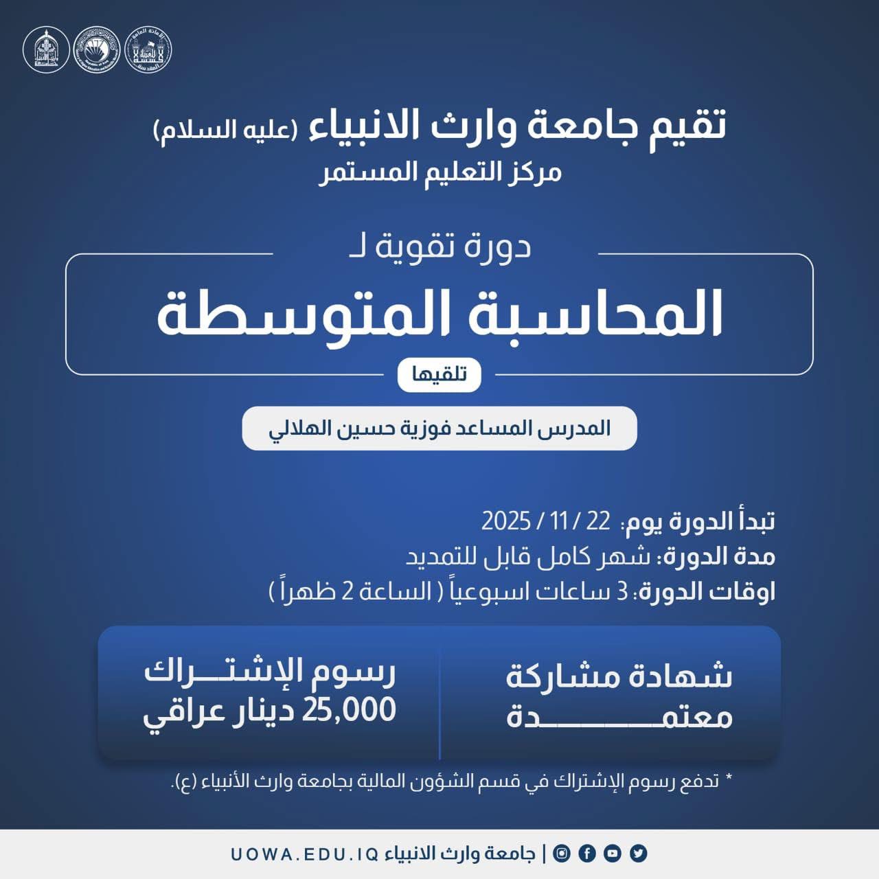 يسر  مركز التعليم المستمر في جامعة وارث الأنبياء (عليه السلام) الإعلان عن استمرار التسجيل على  دورة تقوية للمحاسبة المتوسطة ، التي ستبدأ من 22/11/2025📅، يقدمها المدرس المساعد فوزية حسين الهلالي.📋 تفاصيل الدورة:📆 المدة: شهر كامل قابلة للتمديد.⏰ الأوقات: 3 ساعات أسبوعيًا. (الساعة 2 ظهرًا)🌟 مميزات الدورة:📜  شهادة مشاركة معتمدة💰 الرسوم: 25,000 دينار عراقي، تدفع في قسم الشؤون المالية بجامعة وارث الأنبياء (ع).رابط التسجيل:https://forms.gle/oXYv4bWspLw85w2q6📞 لمزيد من التفاصيل:📩 البريد الإلكتروني:[email protected]