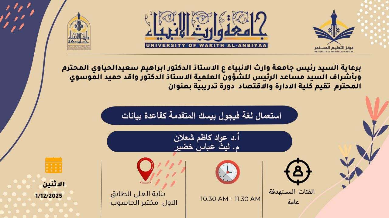 تقيم كلية الإدارة والاقتصاد في جامعة وارث الانبياء (ع) دورة بعنوان "استعمال لغة فيجوال بيسك كقاعدة بيانات"