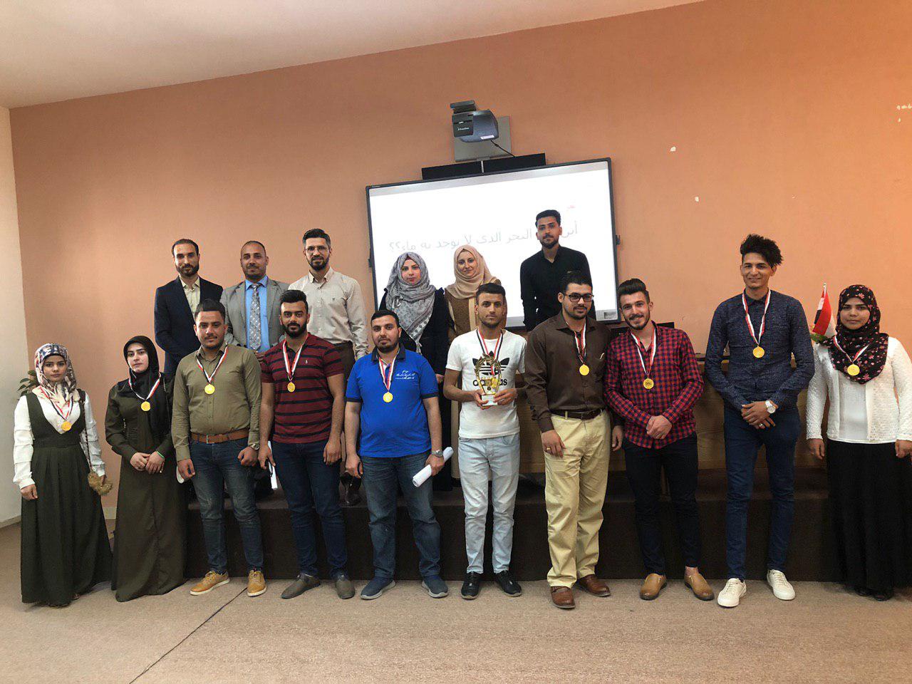 ضمن النشاطات اللاصفية لطلبة كلية الادارة والاقتصاد اقيمت الجولة النهائية للمسابقة علمية بين قسم ادارة الاعمال - مرحلة اولى وقسم المحاسبة - مرحلة اولى شعبة a وقد فاز في المسابقة فريق المحاسبة -مرحلة اولى شعبة A وقد تم تكريمهم من قبل اللجنة المنظمة مبارك الفوز للفريق الفائز