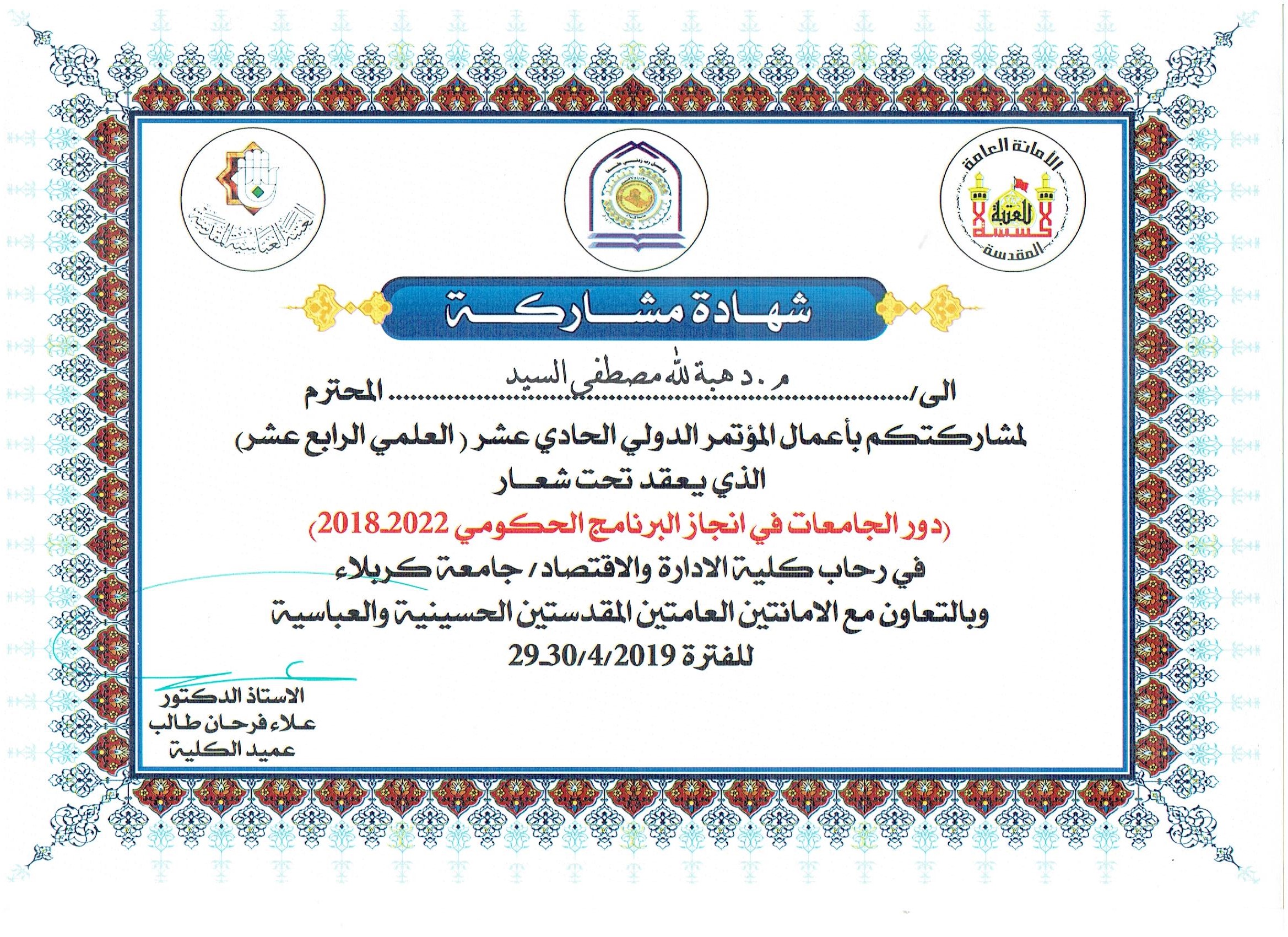 شاركت الدكتورة هبة الله مصطفى السيد علي التدريسية في قسم المحاسبة /كلية الادارة والاقتصاد / جامعة وارث الانبياء في المؤتمر العلمي السابع (لبحوث السوق وحماية المستهلك) والذي انعقد في جامعة بغداد (25) نيسان 2019 , وحصلت الدكتورة هبة الله مصطفى على درع للمشاركة الفعالة و شهادة تقديرية وشهادة مشاركة من مركز بحوث السوق وحماية المستهلك/ جامعة بغداد  وذلك لمشاركتها المتميزة في القاء بحث بعنوان ((تسخير الرقمنة لتحقيق اهداف التنمية المستدامة 2030  , تجربة امارة دبي))