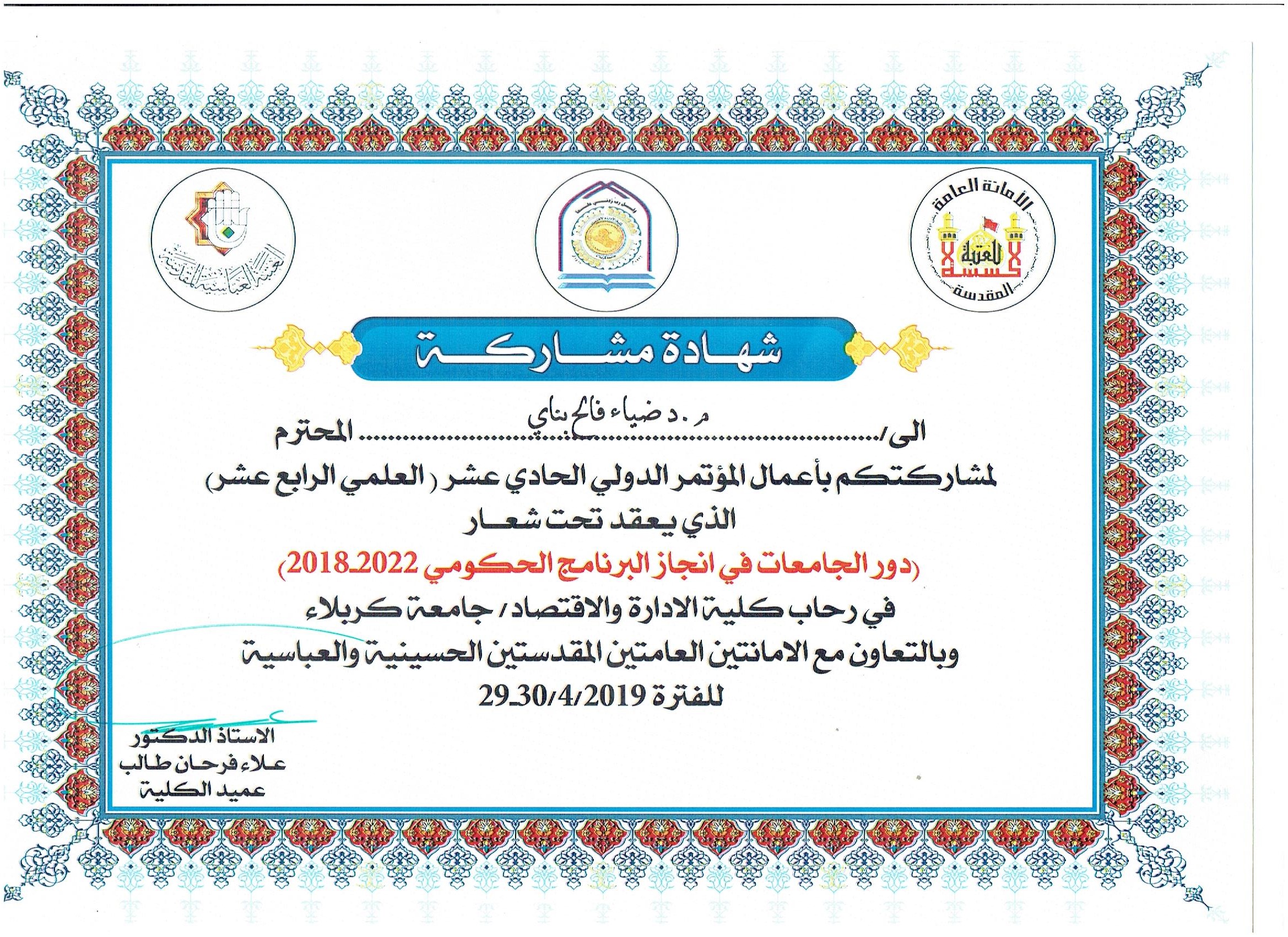 شارك التدريسي م.د ضياء فالح بناي في قسم ادارة الاعمال-كلية الادارة والاقتصاد في المؤتمر الدولي الحادي عشر (العلمي الرابع عشر) الذي اقامته جامعة كربلاء كلية الادارة والاقتصاد ببحث تحت عنوان (اثر الادارة الرشيقة في البراعة التنظيمية)