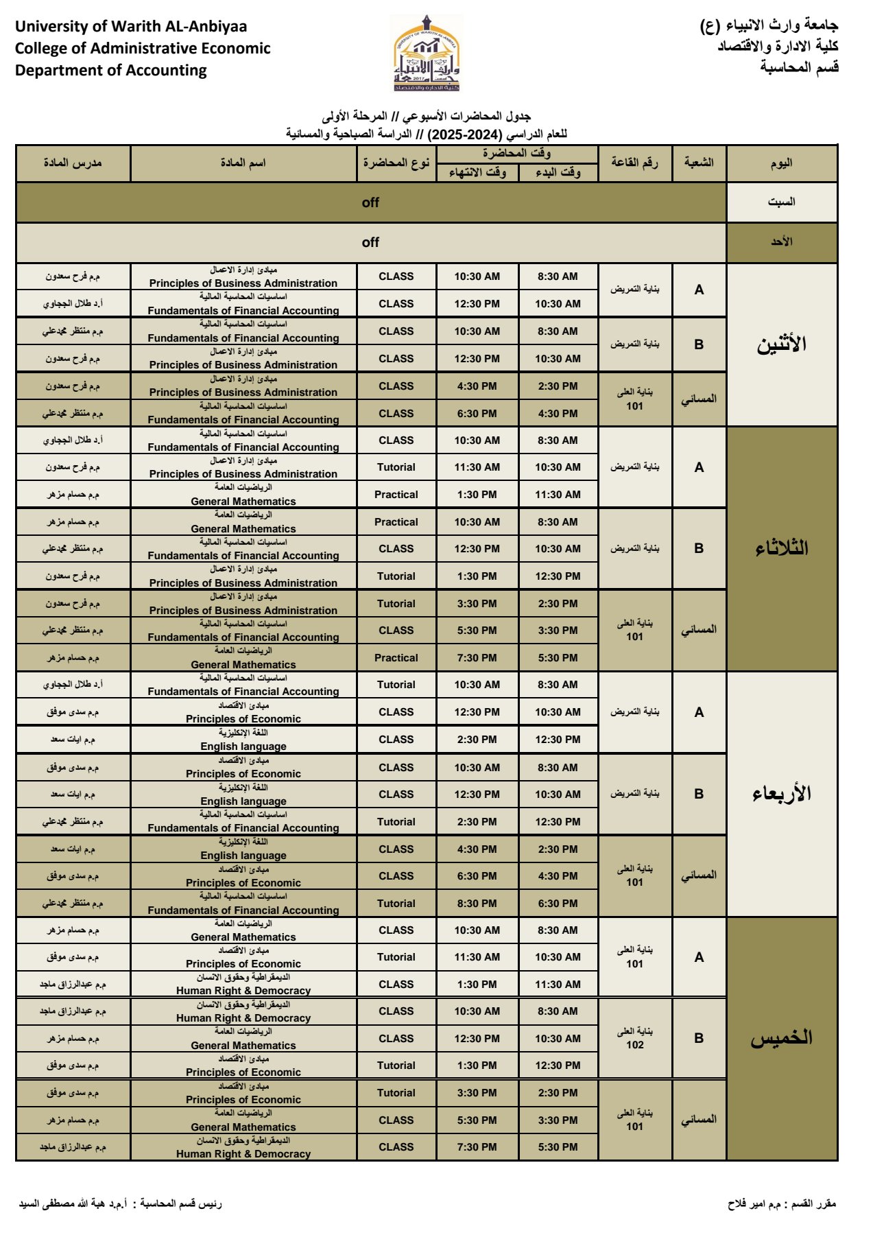 جدول المحاضرات الأسبوعي // المرحلة الأولى للعام الدراسي (2024-2025) // الدراسة الصباحية والمسائية