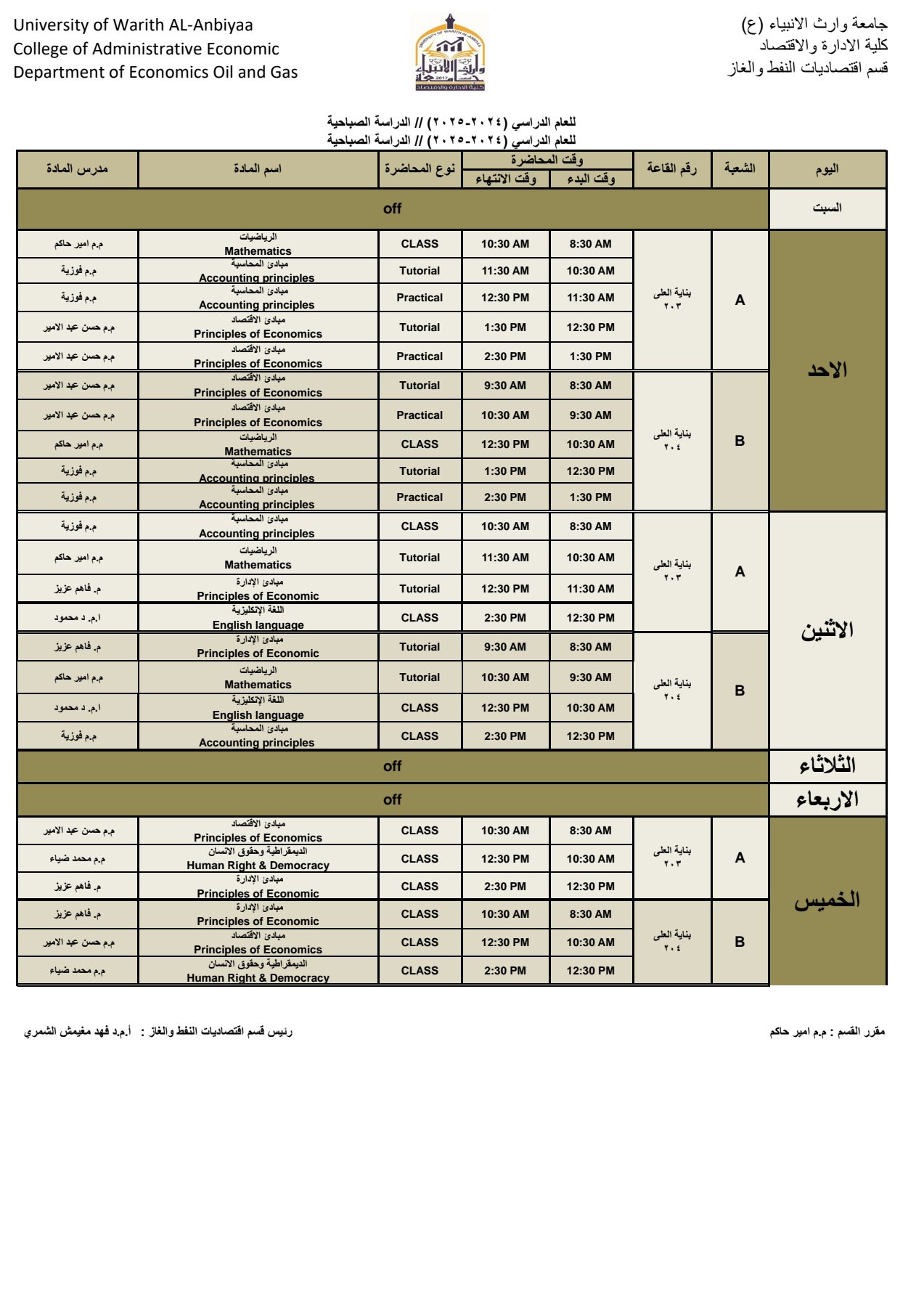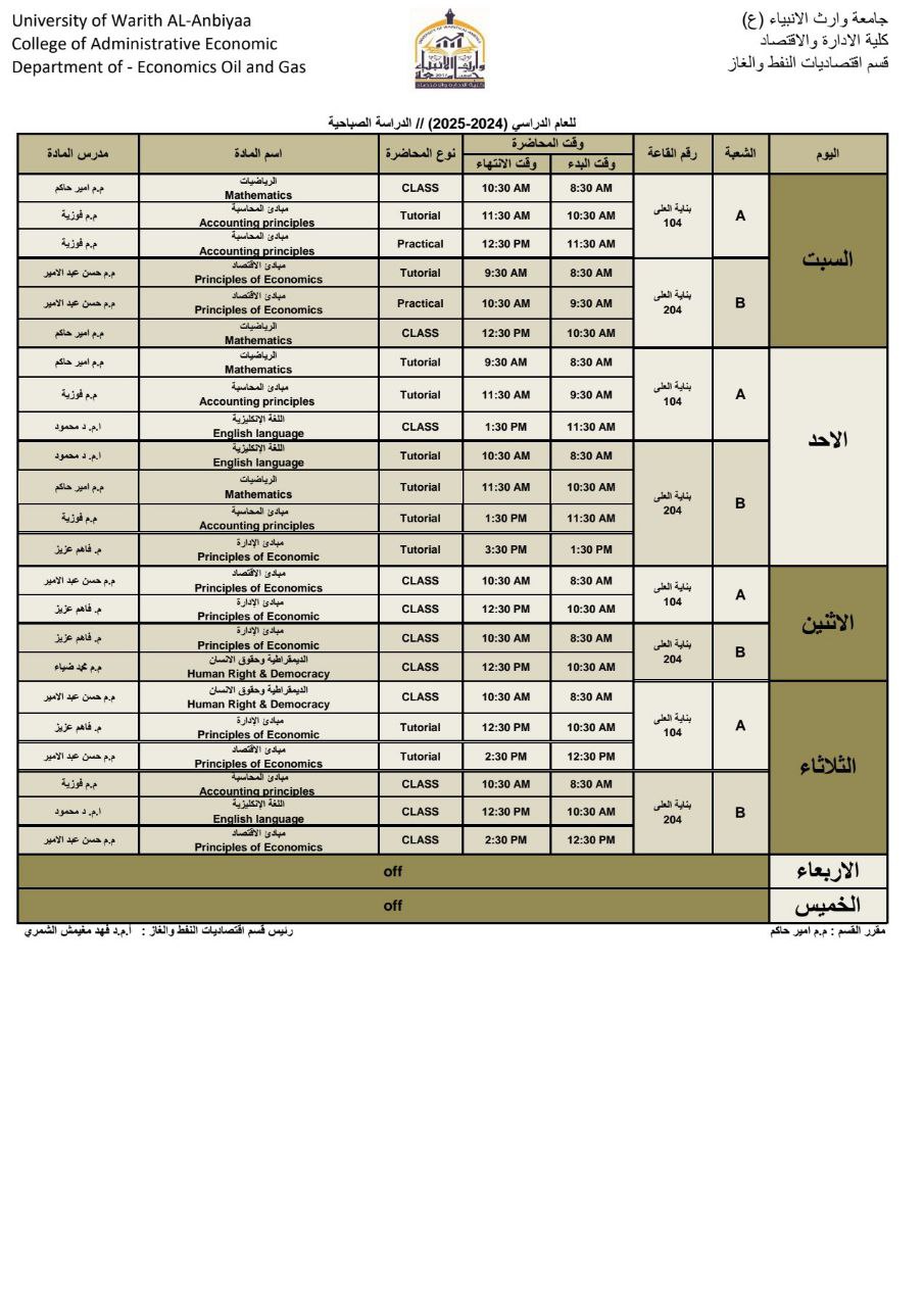 مع بدأ العام الدراسي لطلبتنا الاعزاء نرفق لكم الجدول الاسبوعي لقسم اقتصاديات النفط والغاز 2024-2025 تمنياتنا للجميع بالتوفيق ...