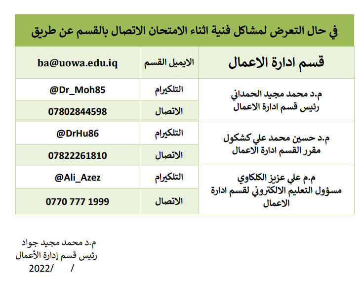 جدول الامتحانات الحضورية والالكترونية لنهاية الكورس الاول للمرحلة الاولى قسم ادارة الاعمال مع التعليمات الامتحانية