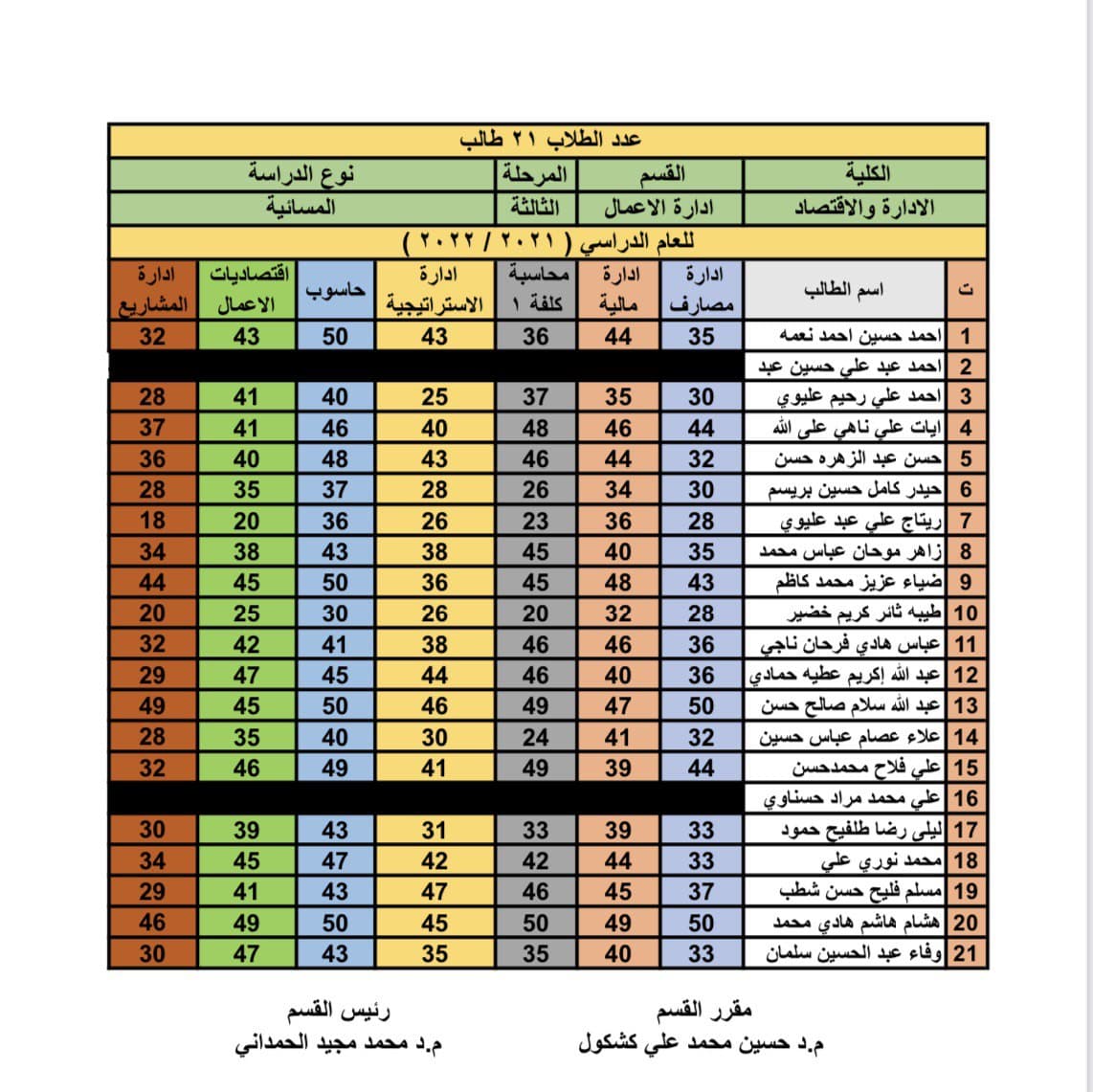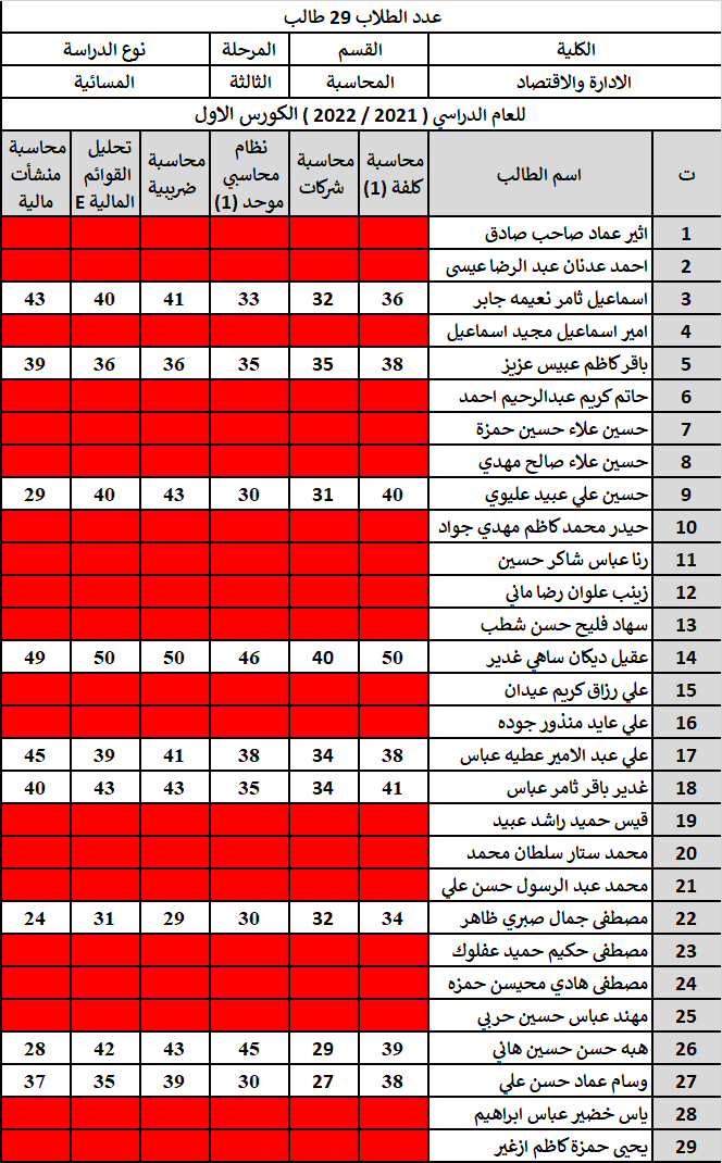 درجات السعي السنوي لطلبة قسم المحاسبة / المرحلة الثالثة مسائي