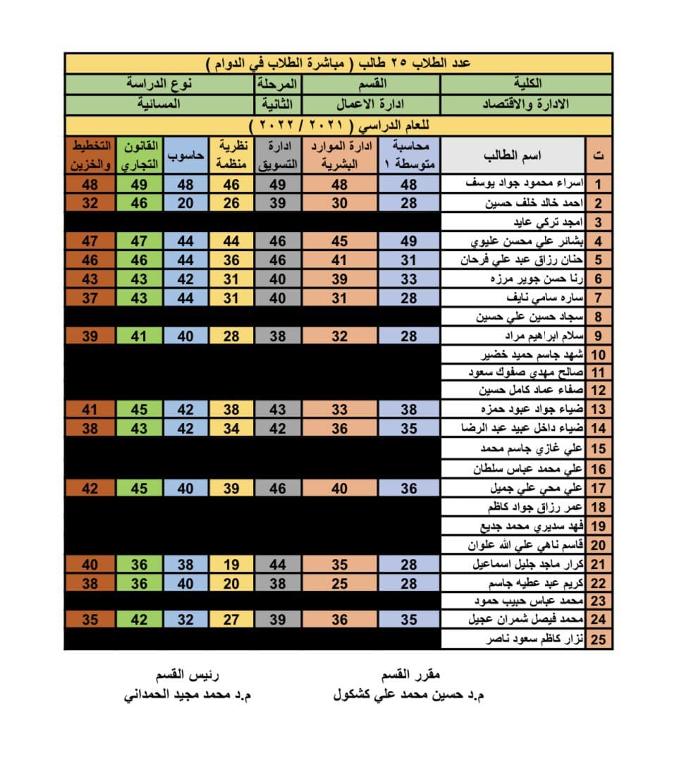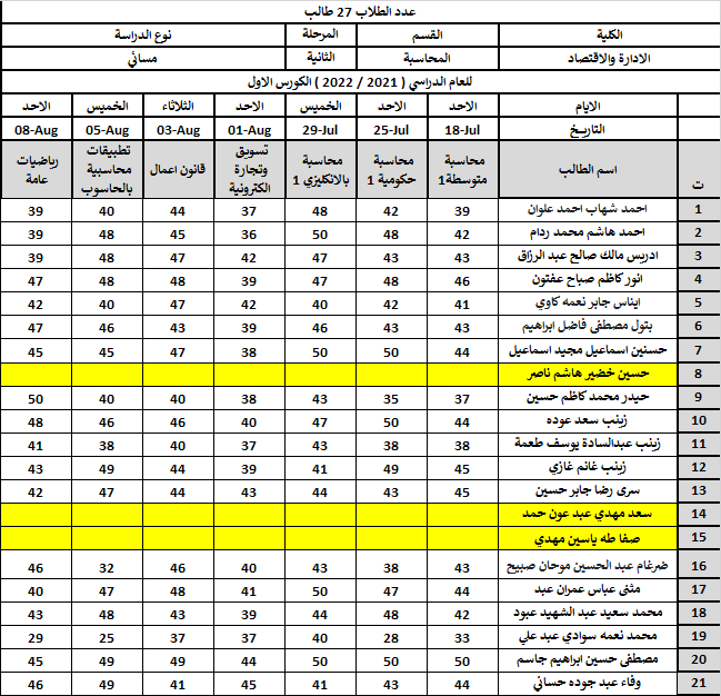 درجات السعي السنوي لطلبة قسم المحاسبة / المرحلة الثانية مسائي