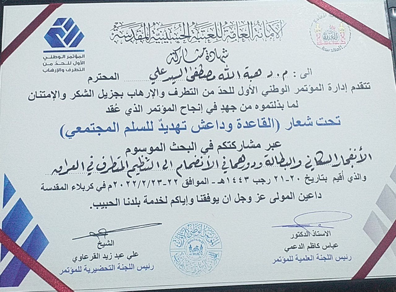 مشاركة علميه مشتركة جمعت بين الاستاذ الدكتور عباس كاظم الدعمي المساعد العلمي لرئيس جامعة وارث الأنبياء والاستاذ الدكتور ابي الوتار من جامعة الموصل والدكتورة هبة الله مصطفى من كلية الادارة والاقتصاد جامعة وارث الأنبياء في المؤتمر الوطني الاول للحد من التطرف والارهاب . شهد في يوم الاربعاء مناقشة البحث الموسوم (الانفجار السكاني والبطالة ودورهما في الانضمام الى التنظيم المتطرف في العراق ).ان الهدف الرئيسي لهذه الدراسة هو الكشف عن الاتجاهات السكانية في العراق خلال الفترة 1974 - 2021 وانعكاس ذلك في حجم القوى العاملة والبطالة الاجبارية – في ظل الاعتماد النفطي المتزايد – وامكانية وجود علاقة بين هذا الشكل من اشكال البطالة والتطرف الفكري، ومن ثم الانخراط بالتنظيم الهداماوصى الباحثون بضرورة نشر روح التسامح والتعاون والبناء في مجتمعنا العراقي بكافة مكوناته من جهة، وفي عدم ترك ماكنة الانفجار السكاني تسير بالسرعة التي تسير بها الان كي لا تتفاقم مشكلة البطالة في مجتمعنا .