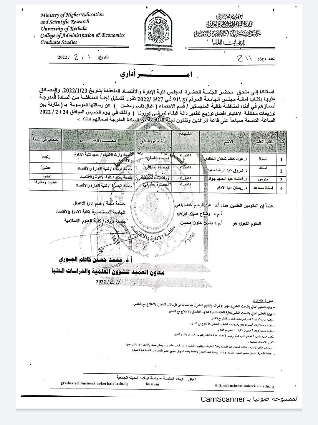 شارك الاستاذ المساعد الدكتور فهد الشمري المعاون العلمي لكليه الادارة والاقتصاد في مناقشة علميه لطالب الدبلوم من قسم الاقتصاد(ناجح شاكر عبد الشاه) عن بحثه الموسوم (تقييم كفاءة الأداءالاقتصادي لمطحنة الحسين ) وذلك في يوم الثلاثاء الموافق ٢٠٢٢/٢/٨ في جامعة كربلاء كليه الادارة والاقتصاد .