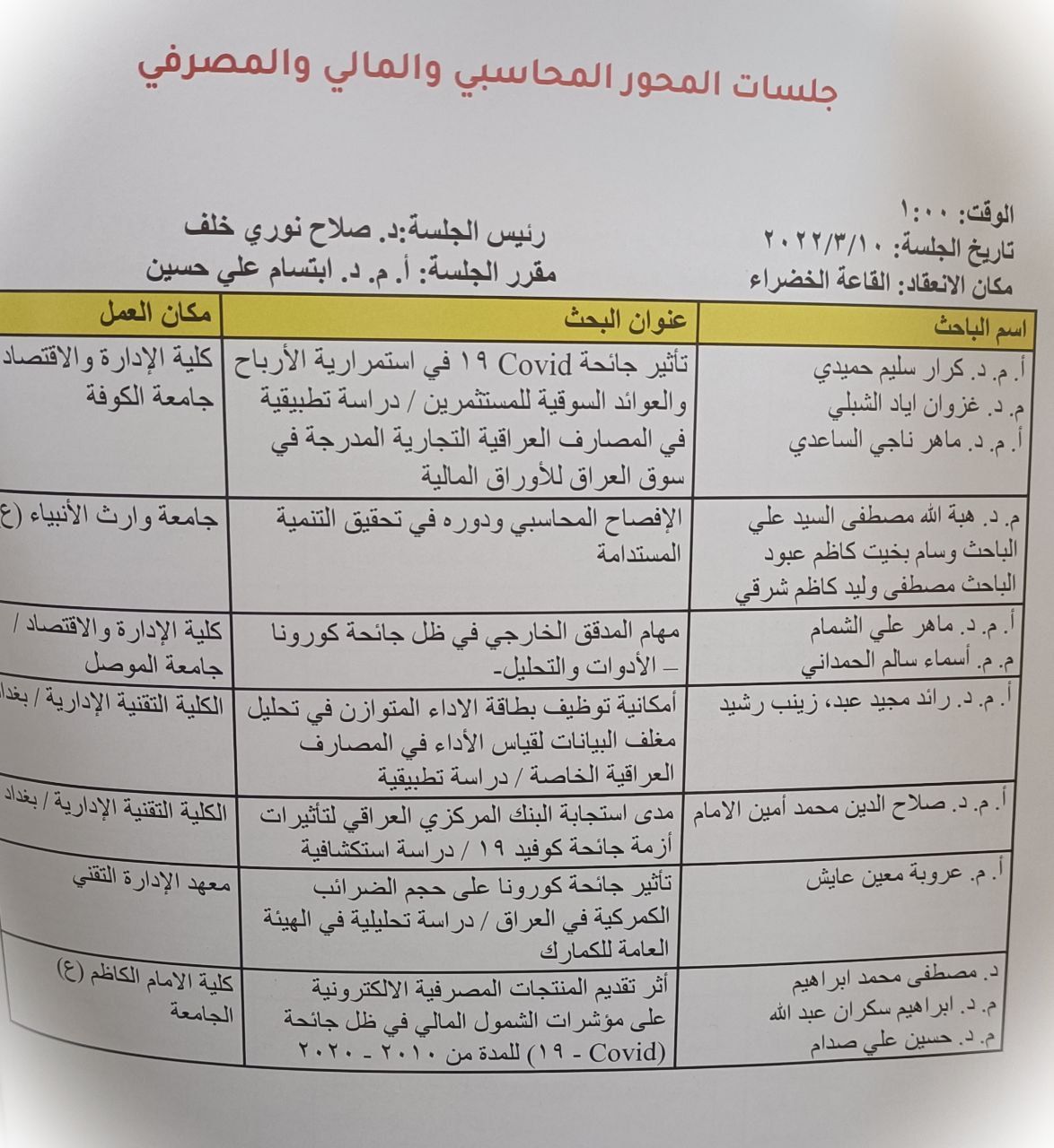 جرى في يوم الخميس ٣/١٠ وفي رحاب الكلية التقنية الادارية في بغداد شاركت الدكتورة هبة الله مصطفى رئيس قسم المحاسبة في جامعة وارث الأنبياء / كلية الادارة والاقتصاد والباحث وسام بخيت والباحث مصطفى وليد عن بحثهم الموسوم الافصاح المحاسبي ودوره في تحقيق التنميه المستدامة ؛ وقد ناقشوا البحث بطريقة مستفاضة واثبت البحث بأن لمستوى زيادة درجة الافصاح المحاسبي تأثير في تحقيق التنميه المستدامة وخلص البحث في العديد من التوصيات ومن اهمها ضرورة اللزام الجهات المختصة في تطبيق تجربة بورصة البحرين في الاستدامة .