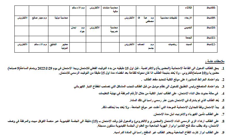جدول الامتحانات النهائية لقسم المحاسبة للعام الدراسي 2021-2022 للدراستين الصباحية والمسائية