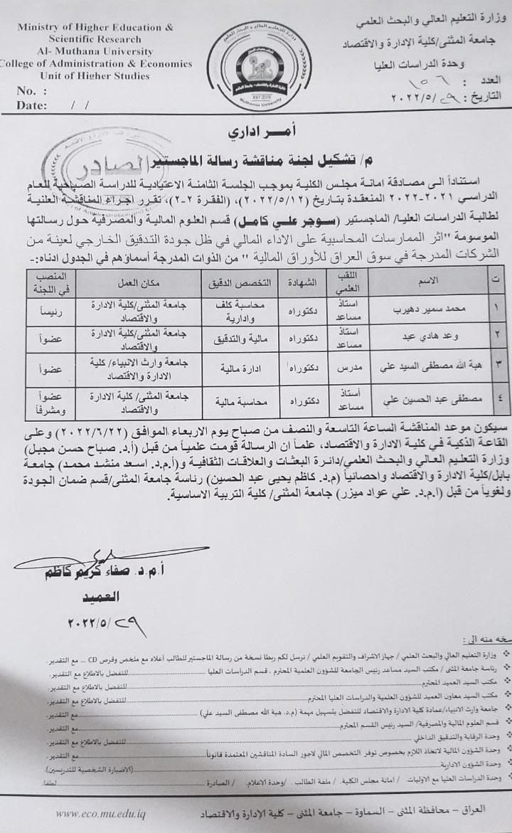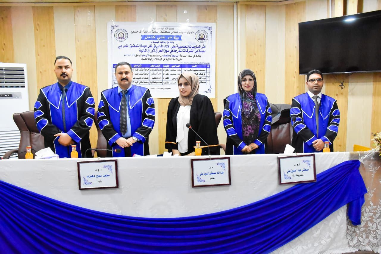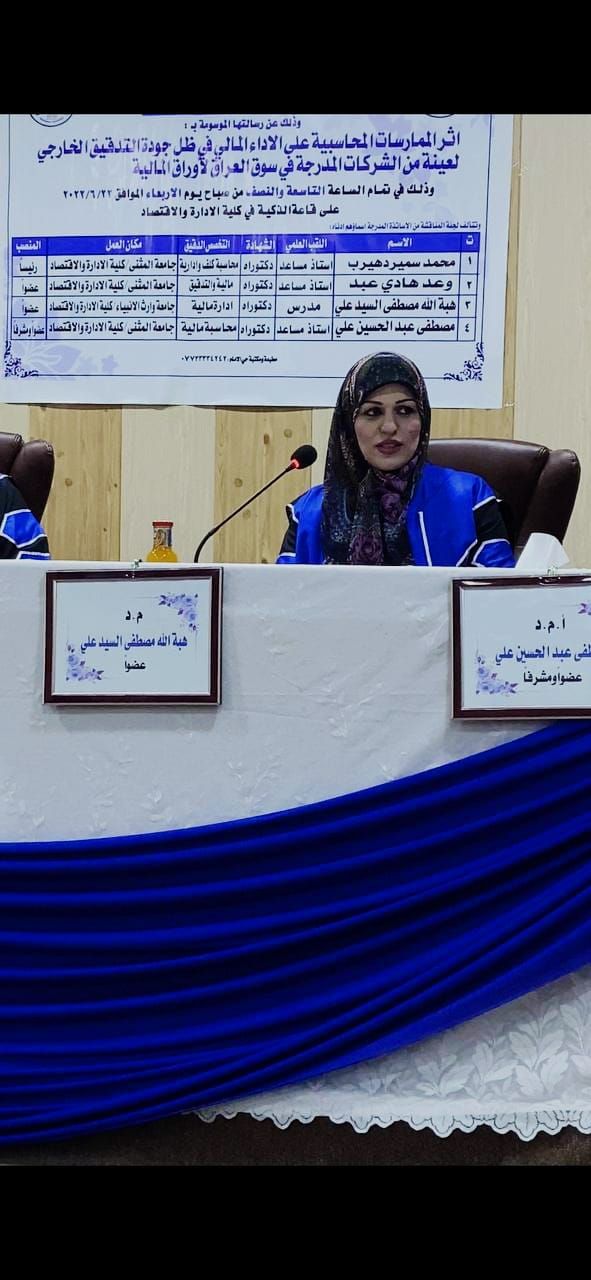 في يوم الاربعاء والمصادف ٢٢/٦/٢٠٢٢ وتجسيدا لمبدأ التؤامة و التعاون العلمي والبحثي بين مؤسسات التعليم العالي شاركت الدكتورة (هبة الله مصطفى) رئيس قسم المحاسبة في عضوية مناقشة لرسالة الماجستير الموسومة (اثر الممارسات المحاسبيه على الأداءالمالي في ظل جودة التدقيق الخارجي)، للطالبة سوجر علي كامل في جامعة المثنى كلية الادارة والاقتصاد لقسم العلوم الماليه والمصرفيه، وتألفت لجنة المناقشة من: