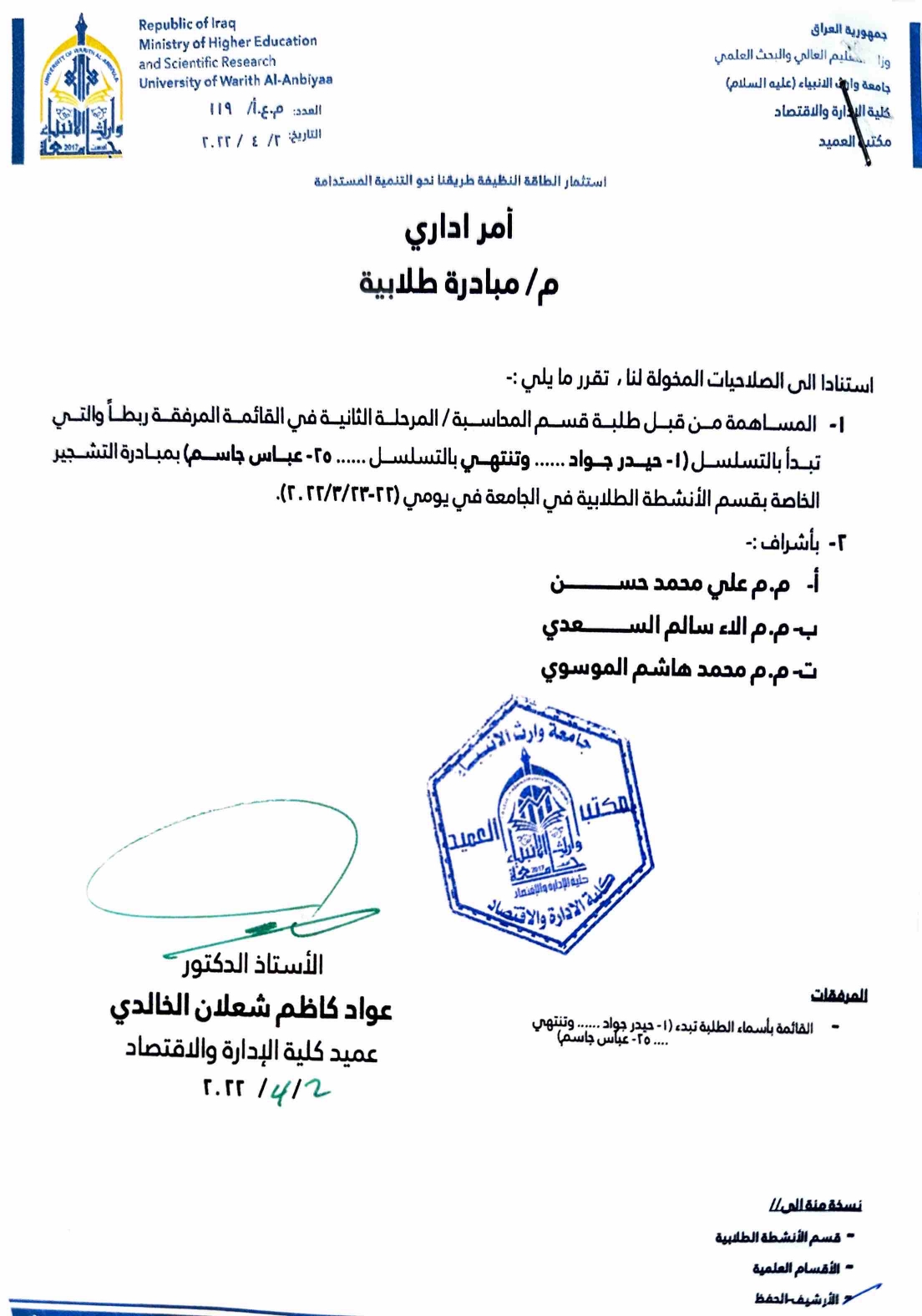 شارك فريقين من كلية الادارة والاقتصاد لقسم ادارة الاعمال المرحلة الثانية والثالثة والرابعة في بطولة وارث للكرة الخماسية