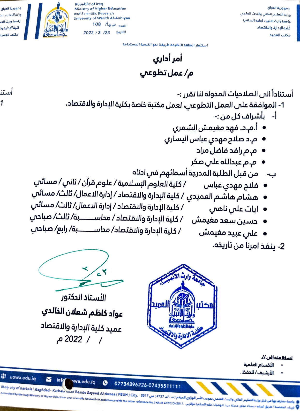 قيام طلبة كلية الادارة والاقتصاد بعمل تطوعي يخدم العملية التعليمية اذ يتضمن التبرع بالكتب المنهجية الورقية والعامة الى المكتبة المركزية لجامعتنا