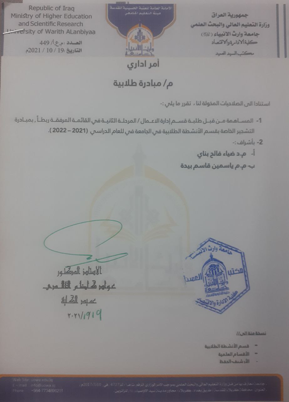 شارك مجموعة من طلبة كلية الادارة والاقتصاد قسم ادارة الاعمال المرحلة الثانية بمبادرة التشجير الخاصة بقسم الانشطة الطلابية في الجامعة