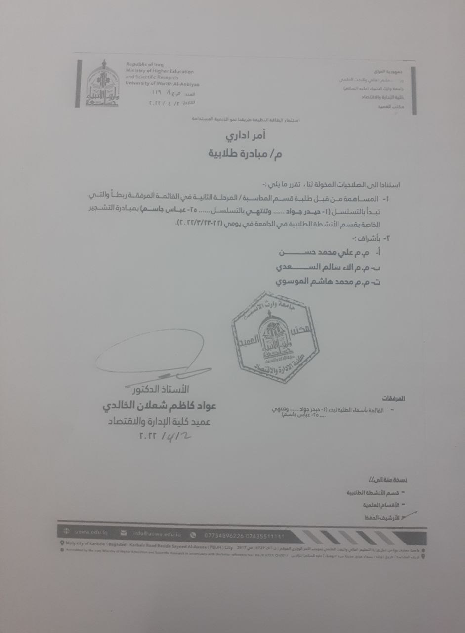 زار طلبة كلية الادارة والاقتصاد مؤسسة وارث للاورام باشراف كل من ( م.د هبة الله مصطفى السيد ) و ( م.م محمد هاشم الموسوي ) و ( م.م الاء سالم مهدي ) و ( م.م حيدر صالح عبد الهادي )