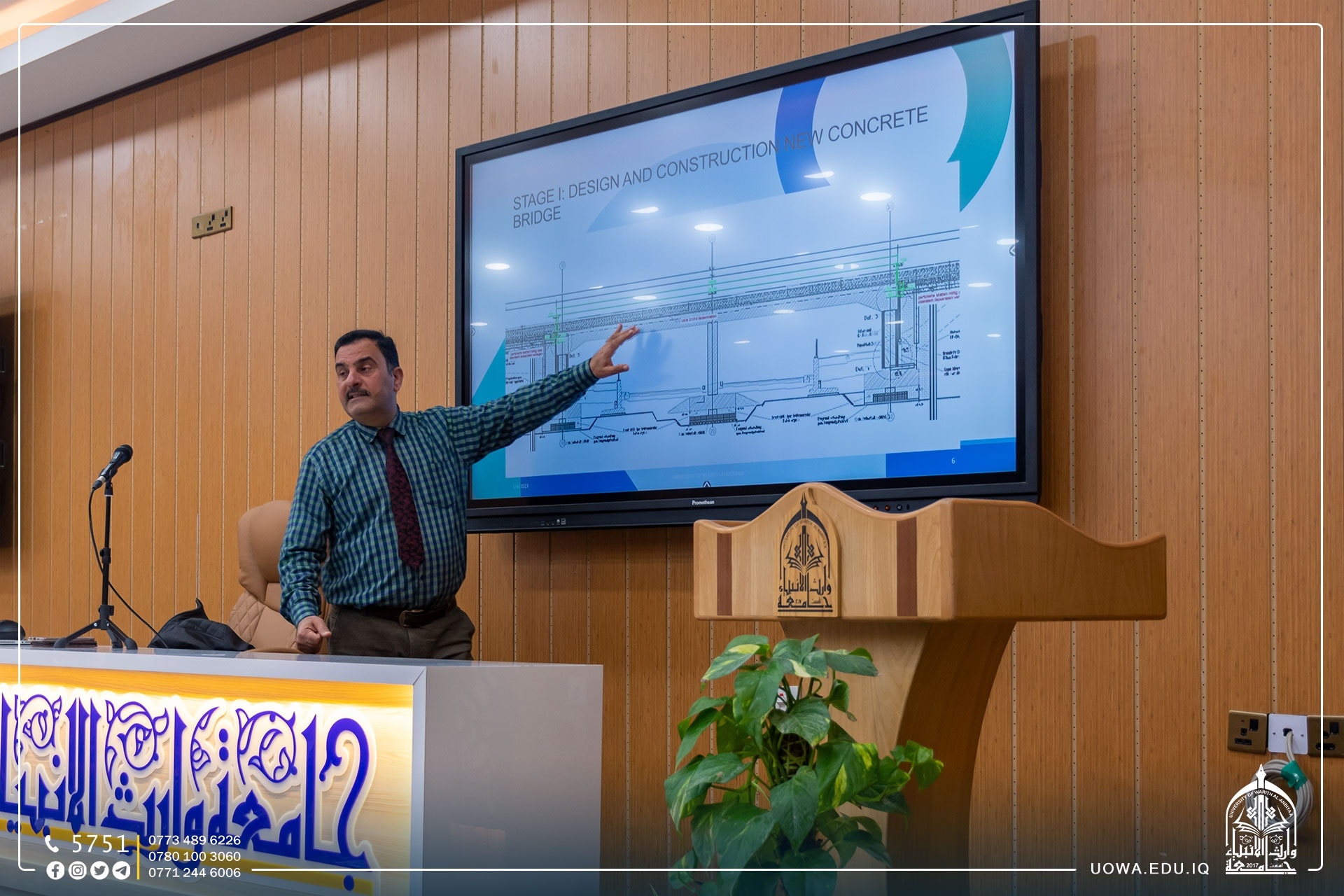 اقام قسم الهندسة المدنية ندوة علمية بعنوان(Modern Construction Technology Using Hydraulic Jacks Systems Rapid Bridge Replacement on 5 Days Timelapse) ، قدمها المتخصص في تصميم الهياكل الحديدية وتصميم المنشئات الكونكريتية الأستاذ الدكتور هيثم حسن متعب الدعمي من جامعة بابل.