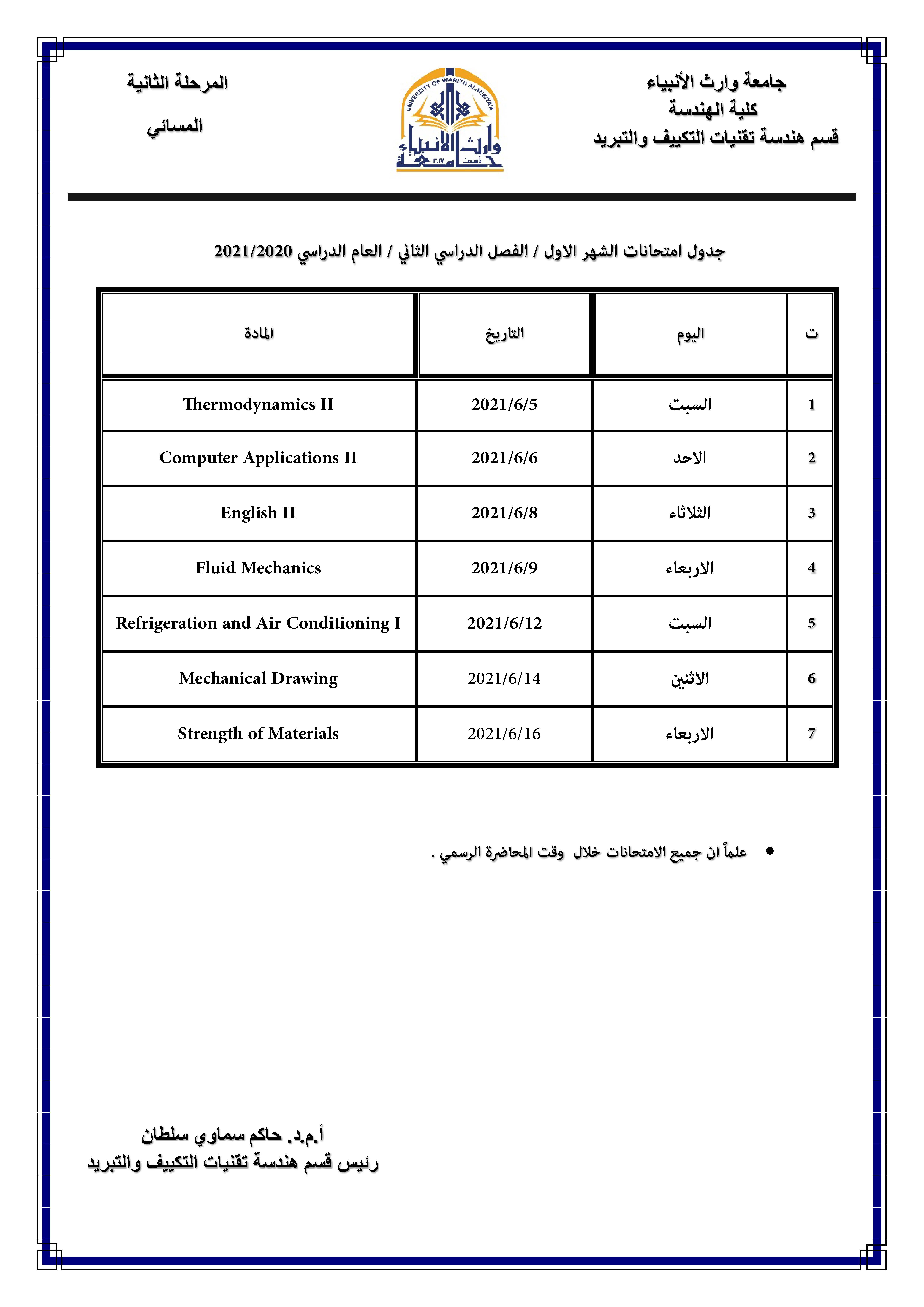 1. يكون امتحان جميع المراحل الساعة الثالثة مساءً وللدراستين الصباحية والمسائية.