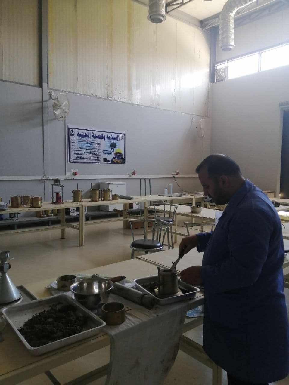 جانب من الجزء العملي من البحث العلمي للتدريسي م.م مصطفى نعيم في مختبرات قسم الهندسة المدنية و الذي يدرس فيه تحسين خصائص التربة إضافة إلى أثر هذه التحسينات على تطبيقات الهندسة المدنية.