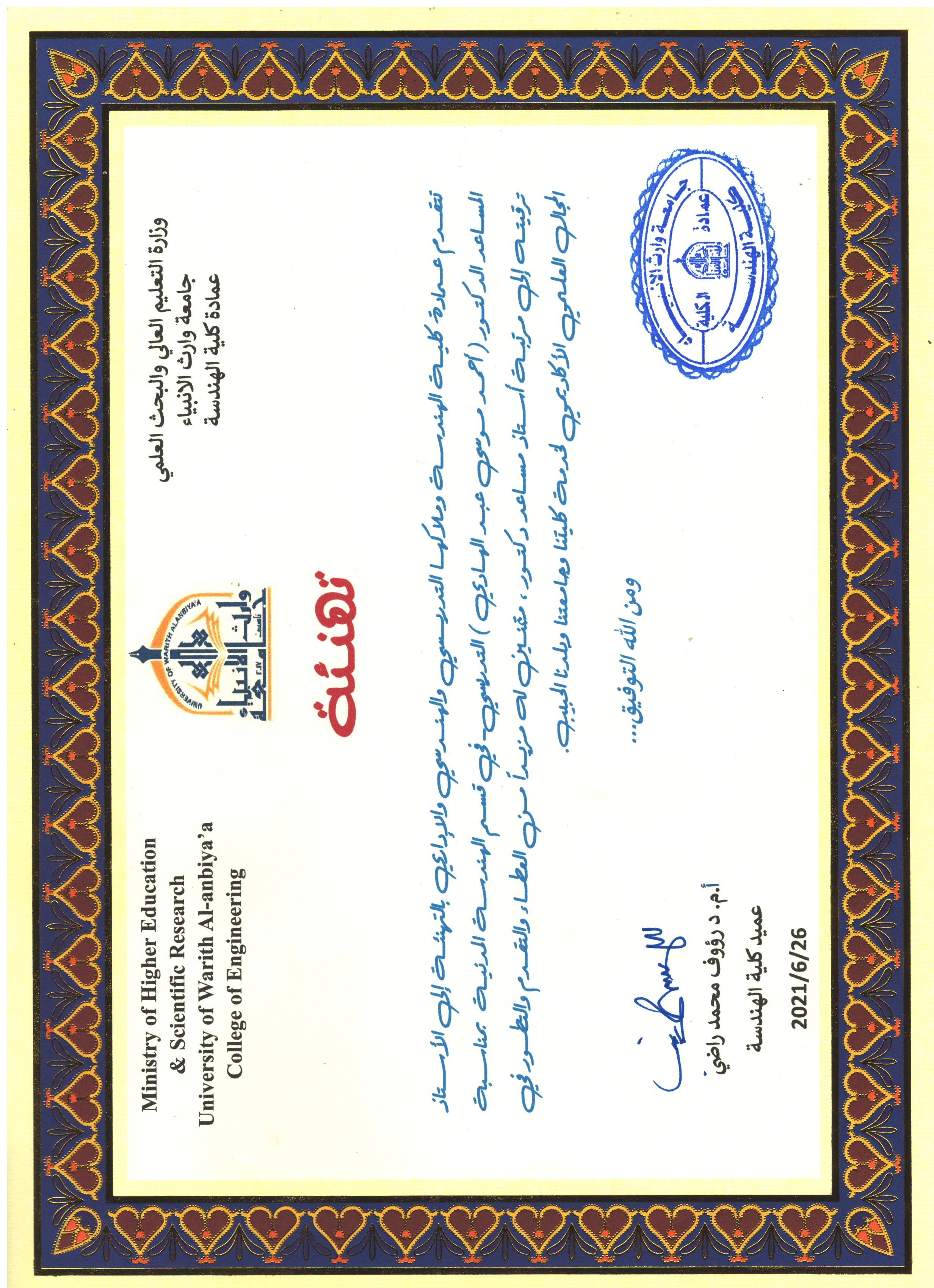 كلية الهندسة تهنئ الدكتور احمد موسى عبدالهادي بمناسبة ترقيته العلمية الى استاذ مساعد
