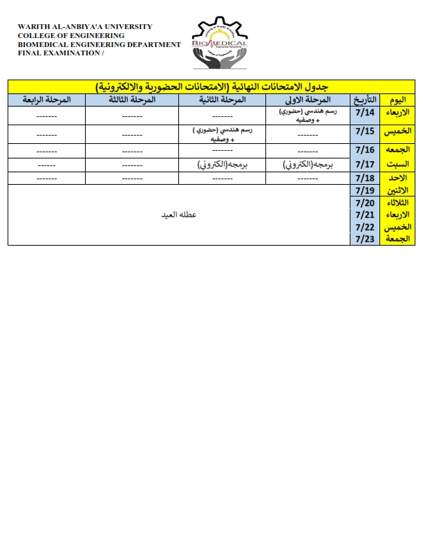 جدول الامتحانات النهائية لطلبة قسم هندسة الطب الحياتي