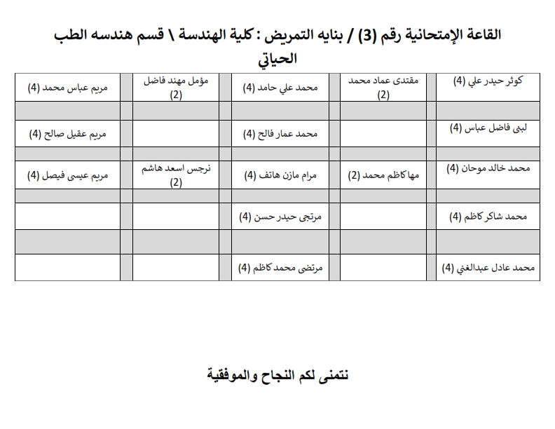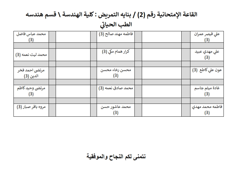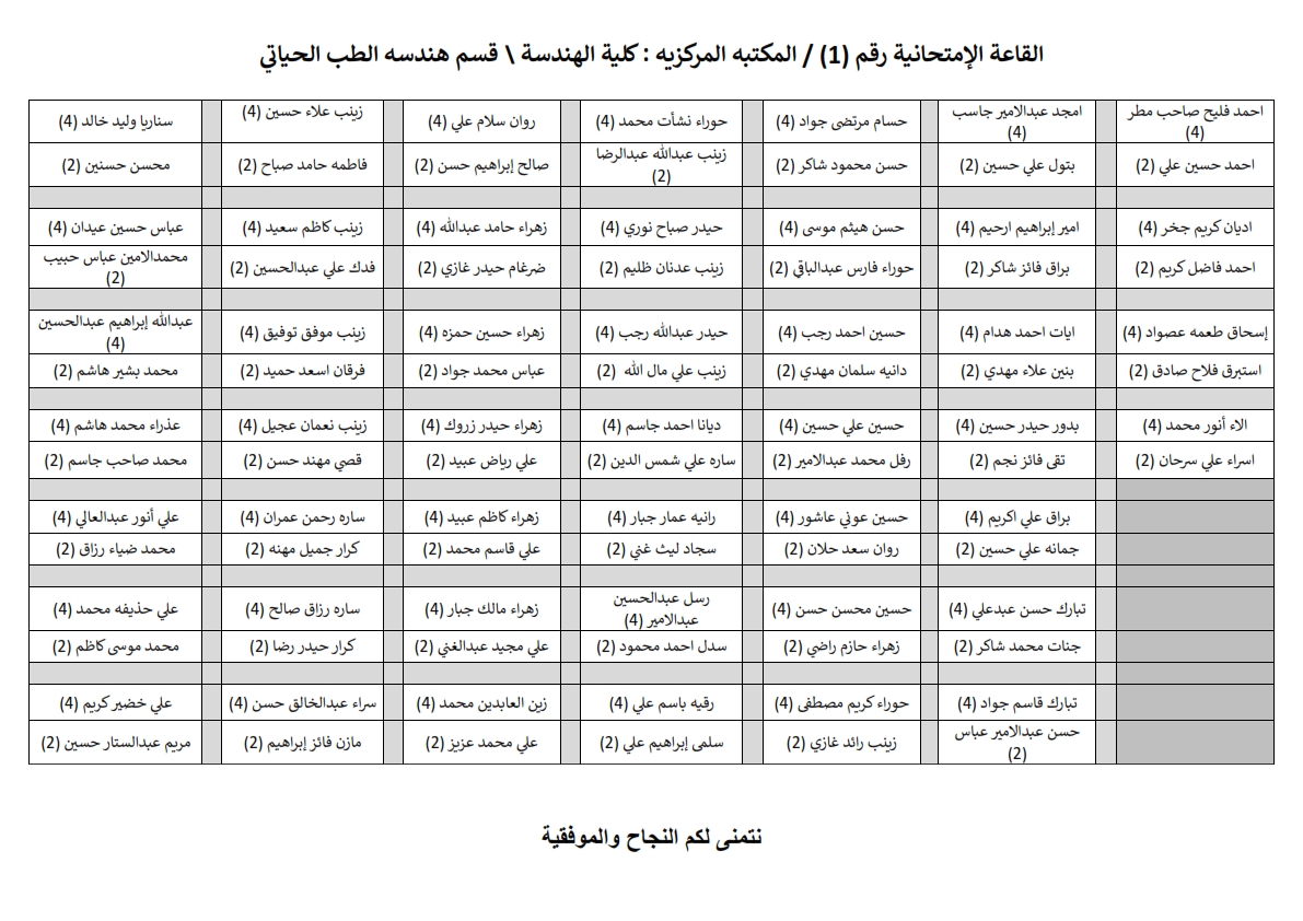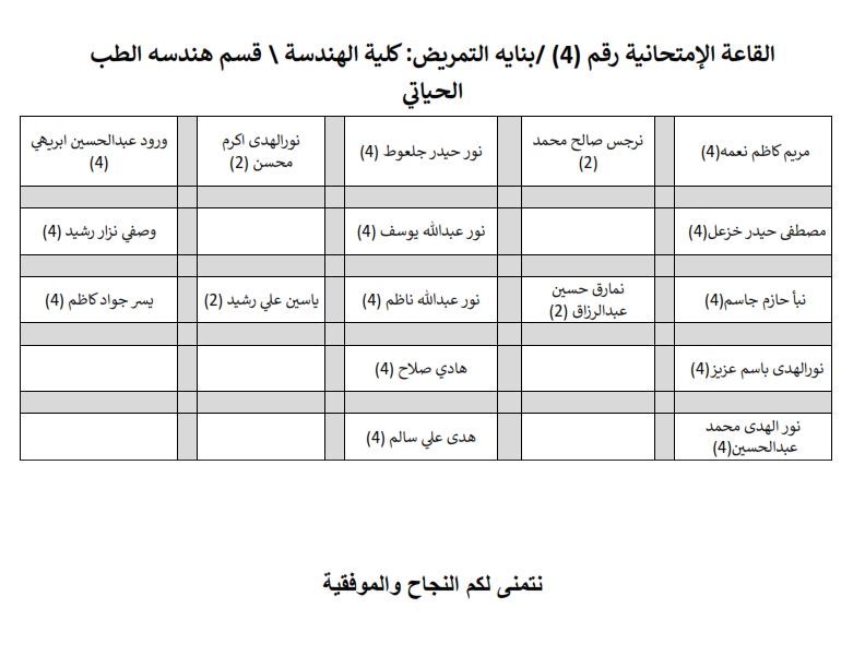 خارطة جلوس طلبة قسم هندسة الطب الحياتي
