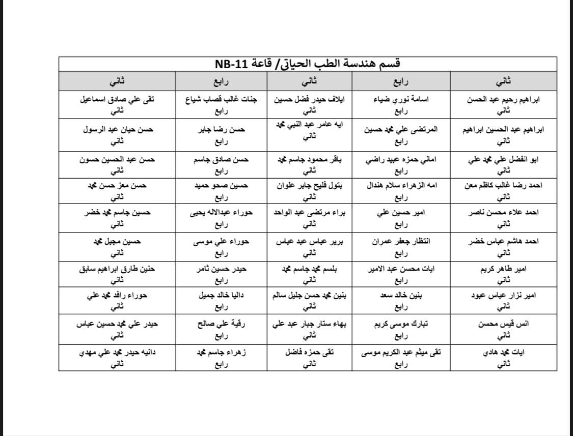 جدول الامتحانات النهائية للفصل الاول لقسم هندسة الطب الحياتي و خارطة توزيع الطلاب في القاعات