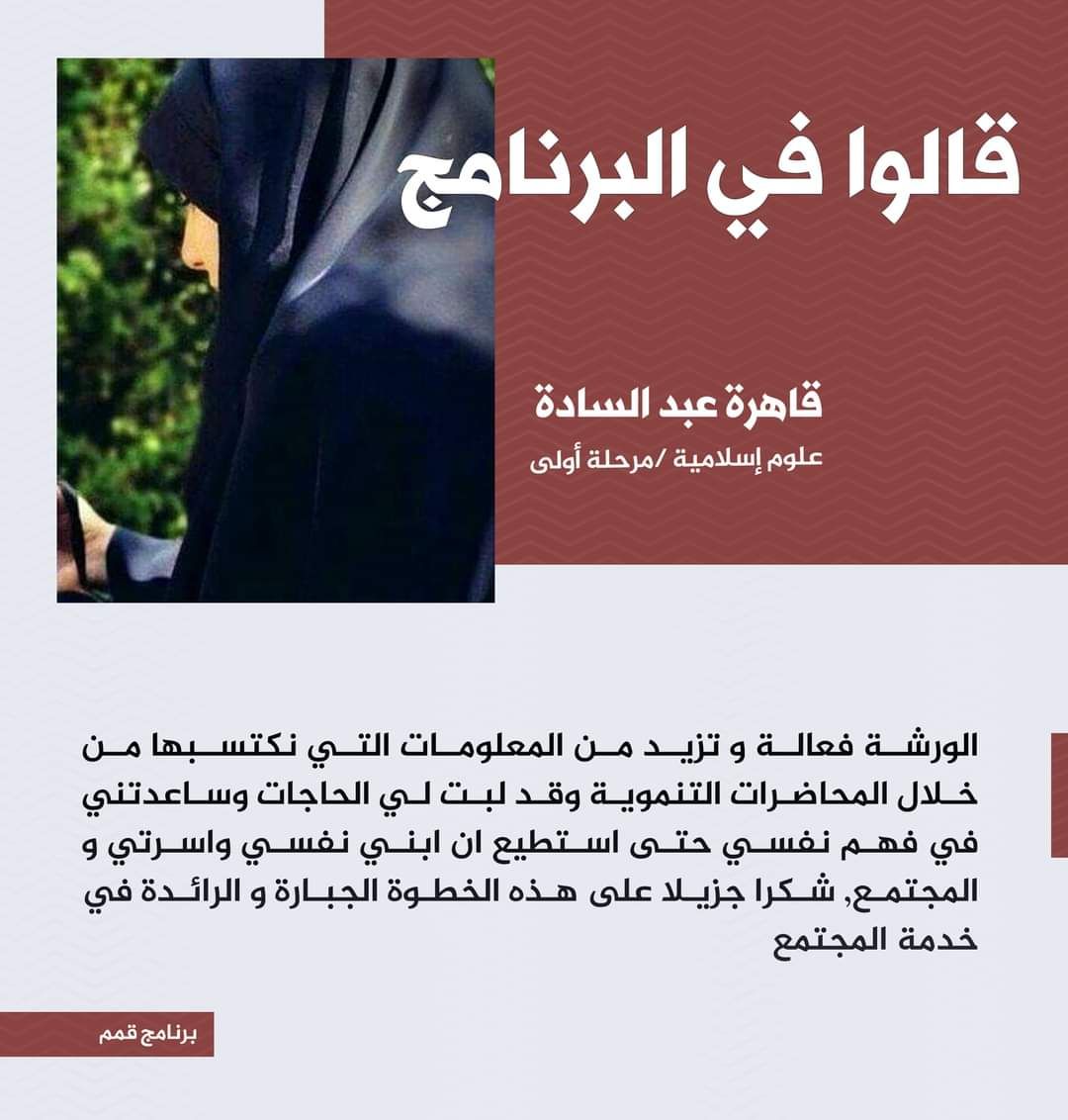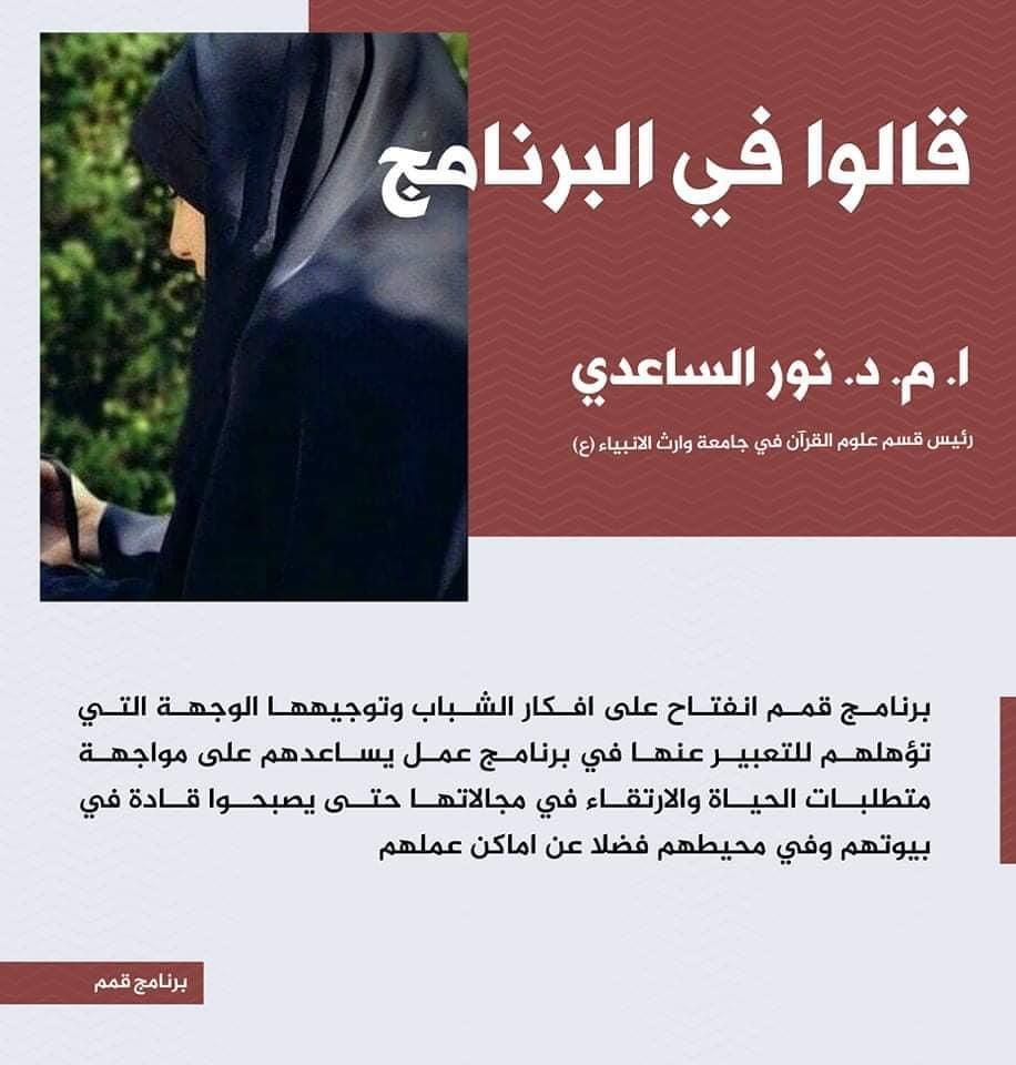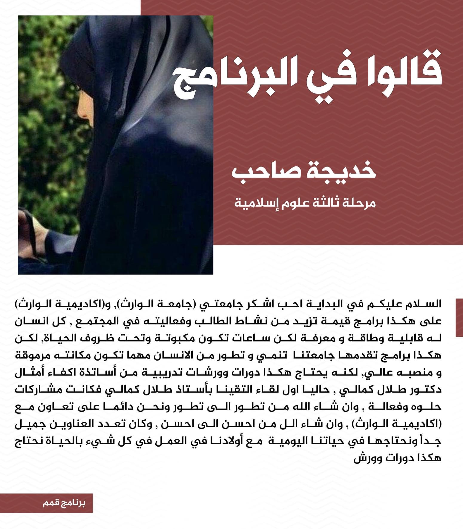 استمرار المحاضرات والورش التطبيقية لبرنامج قمم التدريبي الذي اطلقته كلية العلوم الاسلامية في جامعة وارث الانبياء وباشراف مركز التعليم المستمر وبالتعاون مع اكاديمية الوارث للتنمية البشرية والدراسات الاستراتيحية , ويسعى البرنامج التدريبي الى صقل مواهب الطلبة وتنميتها بما يخدمهم في تحقيق اهدافهم العلمية والاجتماعية :.