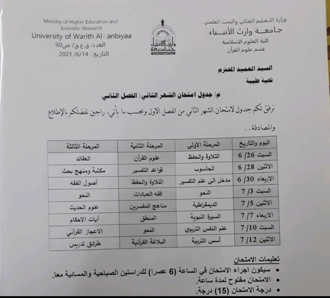 حددت كلية العلوم الاسلامية في جامعة وارث الانبياء موعد انطلاق امتحانات الشهر الثاني من الفصل الدراسي الثاني للعام 2020-2021 والذي ستنطلق في السادس والعشرين من شهر حزيران وسيكون وفق اليات دقيقة بما يحقق الرصانة العلمية عند اداء الامتحانات , متمنين لطلبتنا الاعزاء دوام التوفيق والنجاح وندعوهم الى المثابرة العلمية لتحقيق النجاح.