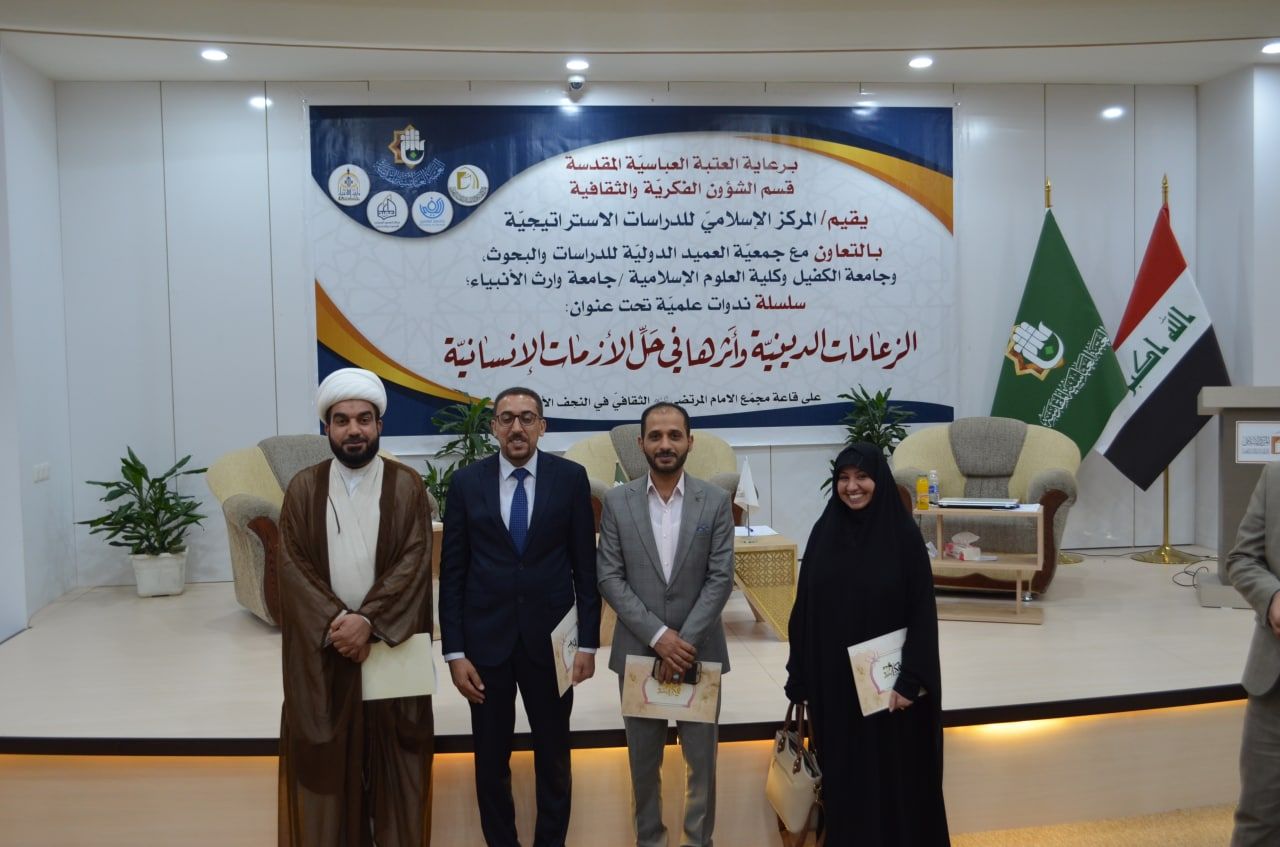 دعوة حضور...برعاية العتبة العباسيّة المقدسةقسم الشؤون الفكريّة والثقافيّةيقيم المركز الإسلاميّ للدراسات الاستراتيجيّةبالتعاون مع كلّيّة العلوم الإسلاميّة / جامعة وارث الأنبياء (ع)وضمن سلسلة ندوات الزّعامات الدّينيّة وأثرها في حلِّ الأزمات الإنسانيّةالندوة الثالثة بعنوان : استشراف المستقبل في علاقة الزّعامات الدّينيّة وآليّات استثمارِهايحاور فيها :* سماحة السـيد رشيد الحسينيّ ، الأستاذ في الحوزة العلميّة* الدكتور طلال الكماليّ ، عميد كلّيّة العلوم الإسلاميّة في جامعة وارث الأنبياء