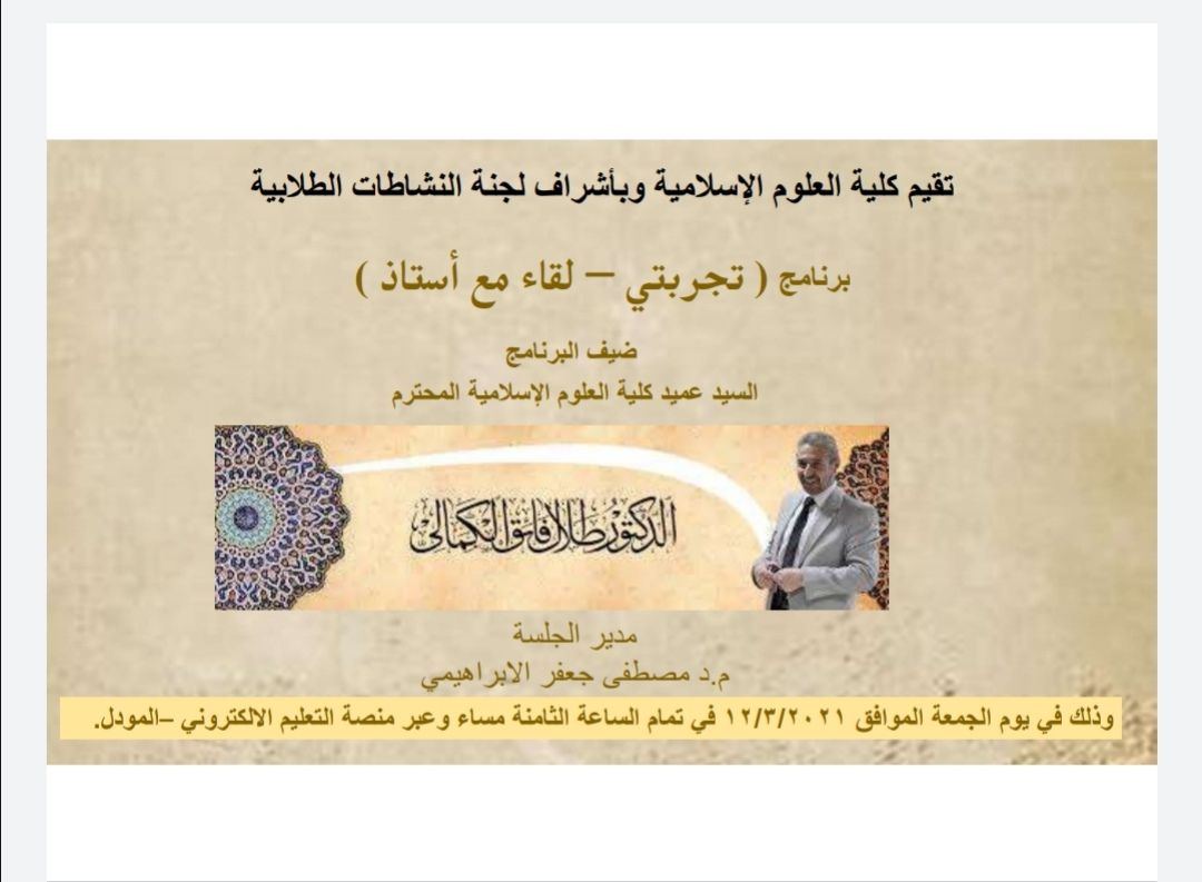 سيكون ضيف ( اللقاء مع استاذ) عميد كلية العلوم الإسلامية الدكتور (طلال فائق الكمالي) في يوم الجمعة الموافق ١٢ / ٣ / ٢٠٢١ في تمام الساعة الثامنة مساء على منصة التعليم الإلكتروني ( المودل) وسيجيب عن اسئلة الطلبة واستفساراتهم بما يخص عنوان هذا اللقاء