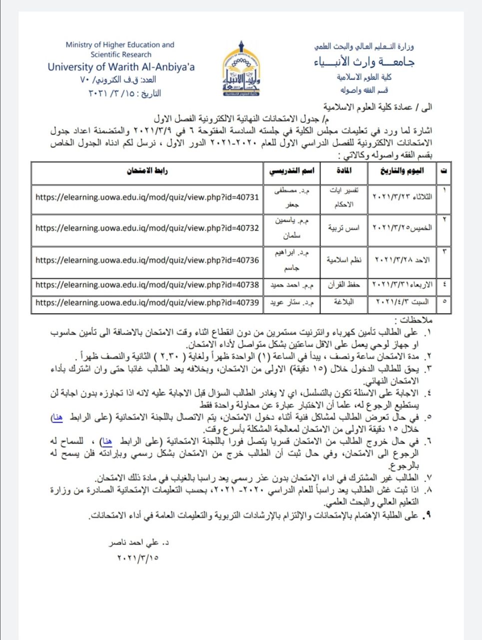 كل التوفيق والسداد لطلبتنا الأعزاء في قسم الفقه واصوله وقسم علوم القرآن