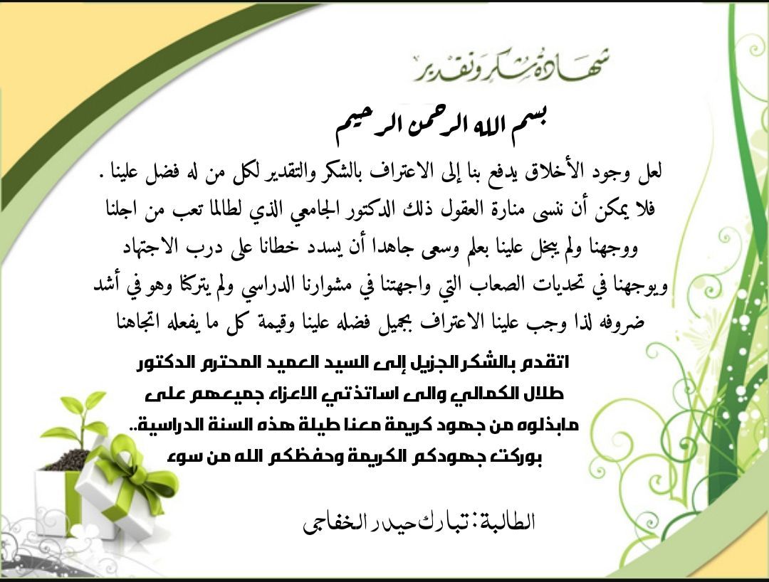 تقدمت الطالبة تبارك حيدر / قسم علوم القرآن بكتاب شكر وتقدير لعمادة كلية العلوم الإسلامية والكادر التدريسي تثيمينا لجهودهم الكريمة في المسيرة العلمية