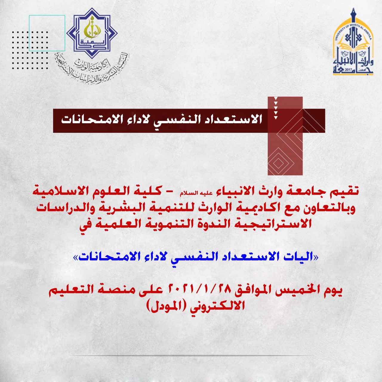 ندوة تنموية علمية يلقيها ( السيد علي الهاشمي) بعنوان ( آليات الاستعداد النفسي لأداء الامتحانات) وذلك في يوم الخميس الموافق ٢٨ /١ / ٢٠٢١ في تمام الساعة الثامنة مساء على منصة التعليم الإلكتروني (المودل).