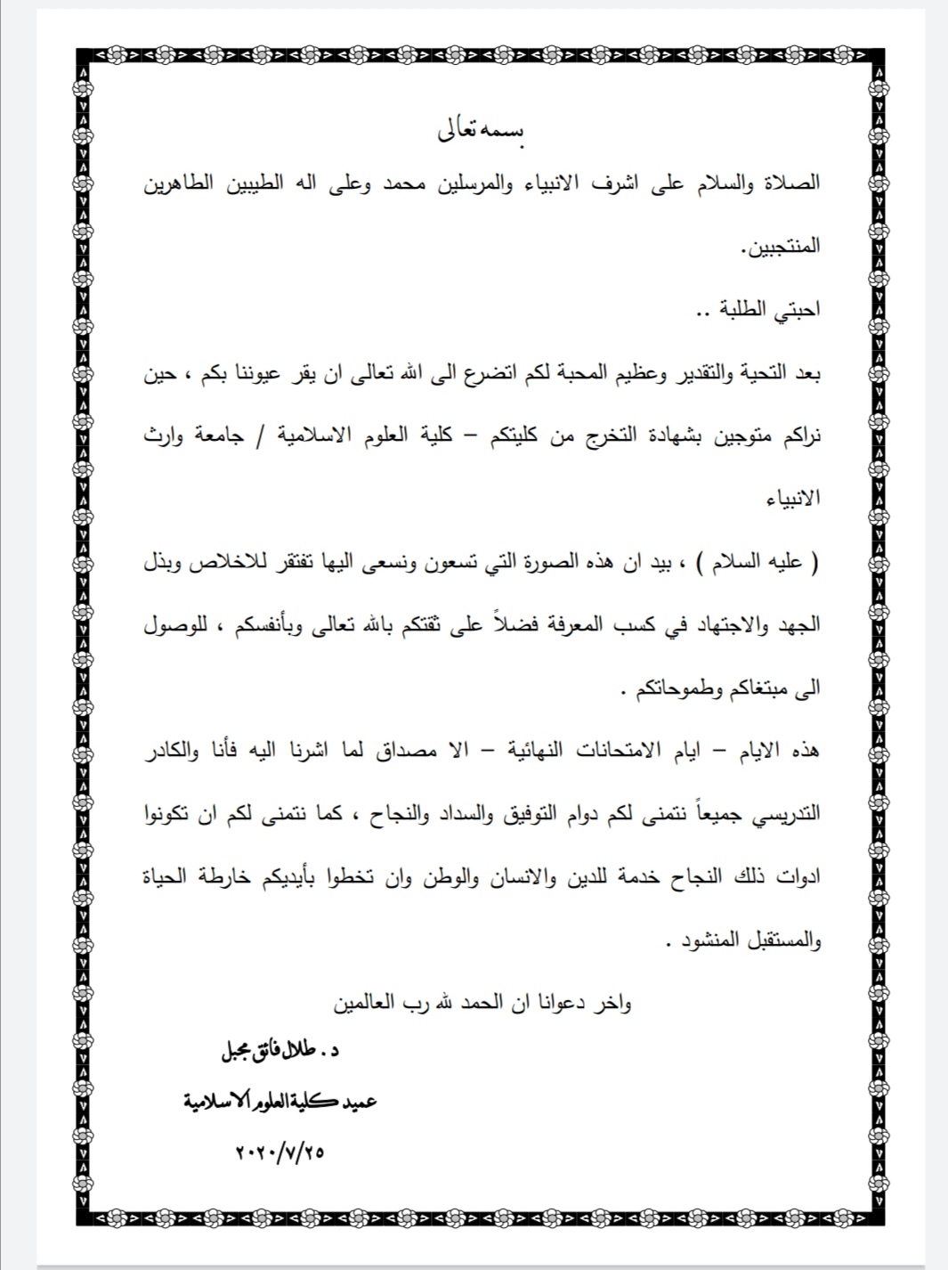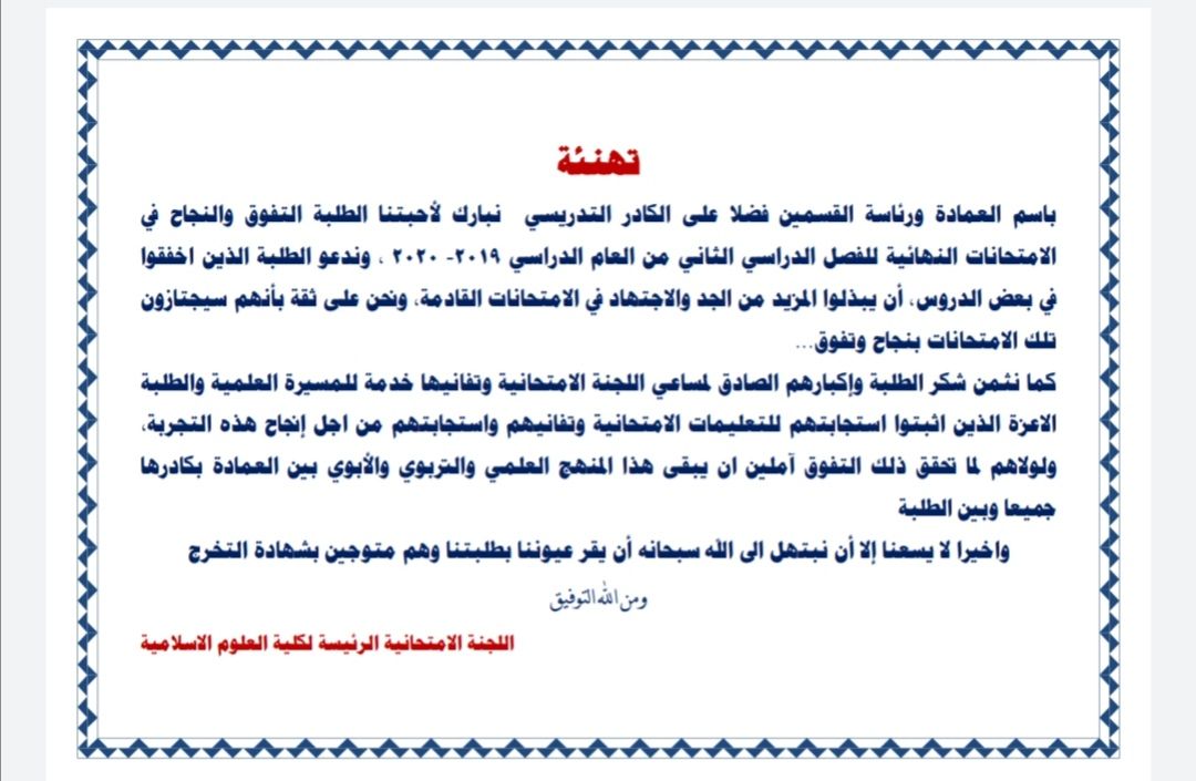 بمناسبة انتهاء الفصل الدراسي الثاني للعام2019-2020 ونجاح عملية التعليم الإلكتروني يتقدم عميد كلية العلوم الإسلامية ( الدكتور طلال فائق الكمالي) والكادر التدريسي الى الطلبة الأعزاء بأجمل التهاني والتبريكات مع فائق الشكر والتقدير على ما بذلوه من مجهود شاق واخلاص وتفان كبير في أداء واجباتهم خلال السنة الدراسية   آملين أن يكون اداء امتحانات الفصل الدراسي الأول لعامنا الدراسي الحالي 2019 _ 2020 بنفس الهمة والاستعداد