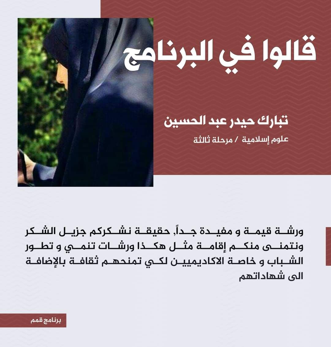 "طالب في كلية العلوم الإسلامية بجامعة وارث الأنبياء يحصد المركز الثاني في مسابقة المشروع القرآني في الجامعات"