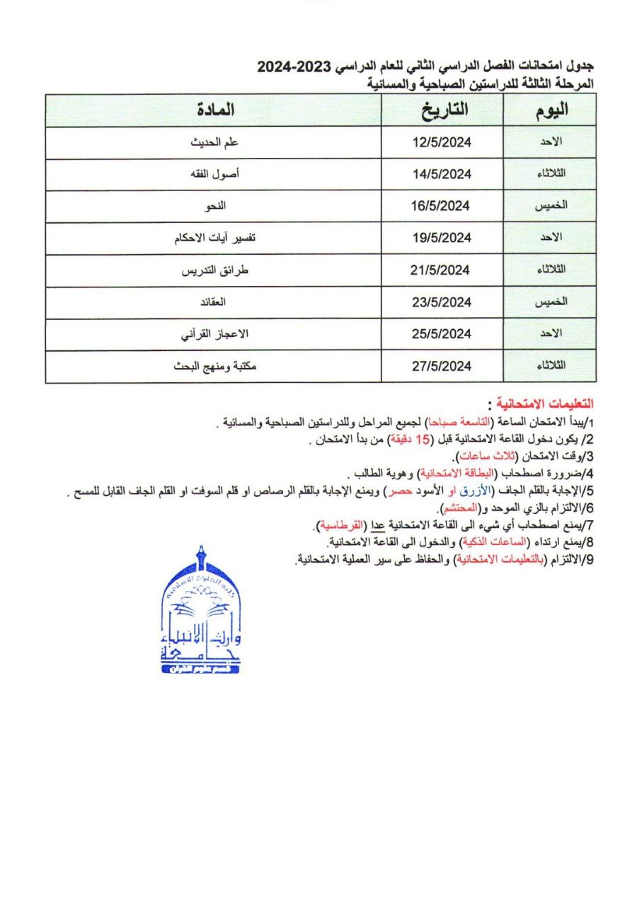 جدول الامتحانات النهائية للفصل الثاني من العام الدراسي 2023-2024 قسم علوم القرآن - المرحلة الثانية - الثالثة