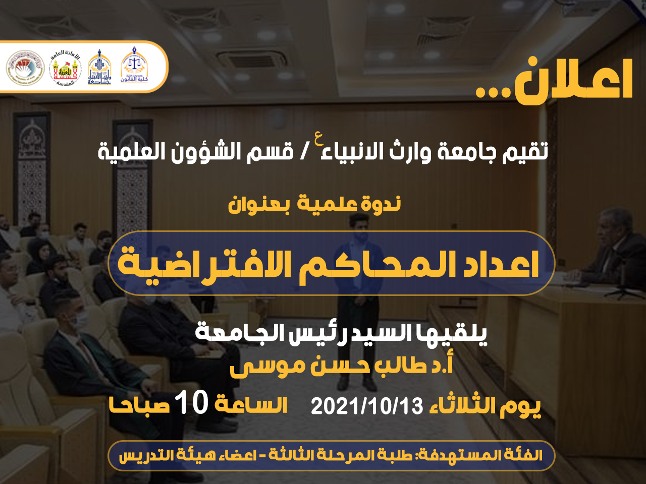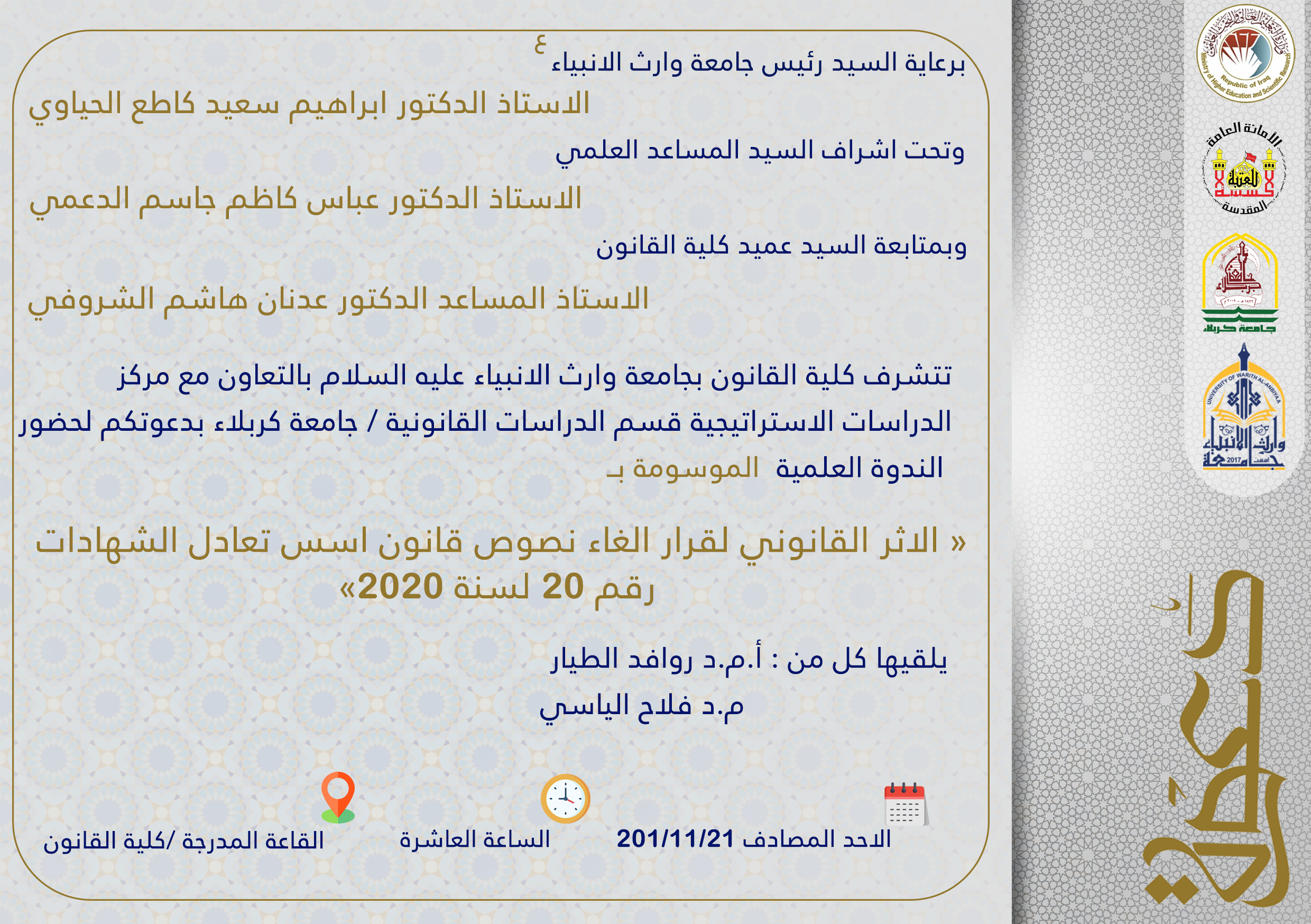 تتشرف كلية القانون بجامعة وارث الانبياء عليه السلام بالتعاون مع مركز الدراسات الاستراتيجية قسم الدراسات القانونية / جامعة كربلاء بدعوتكم لحضور الندوة العلمية الموسومة ب « الاثر القانوني لقرار الغاء نصوص قانون اسس تعادل الشهادات رقم 20 لسنة 2020» يلقيها
