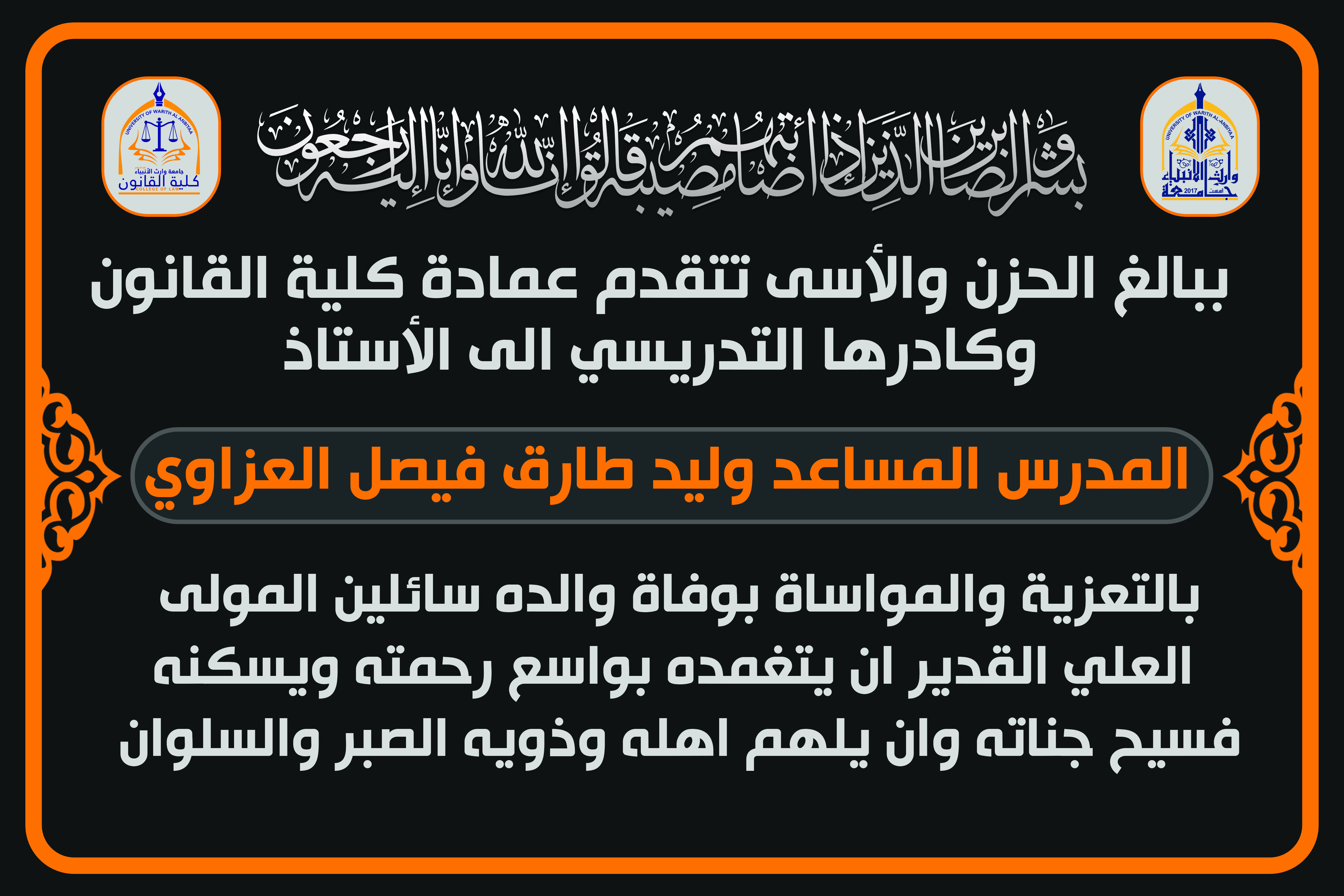ببالغ الحزن والاسى تتقدم عمادة كلية القانون وكادرها التدريسي الى الاستاذ م.م وليد طارق العزاوي